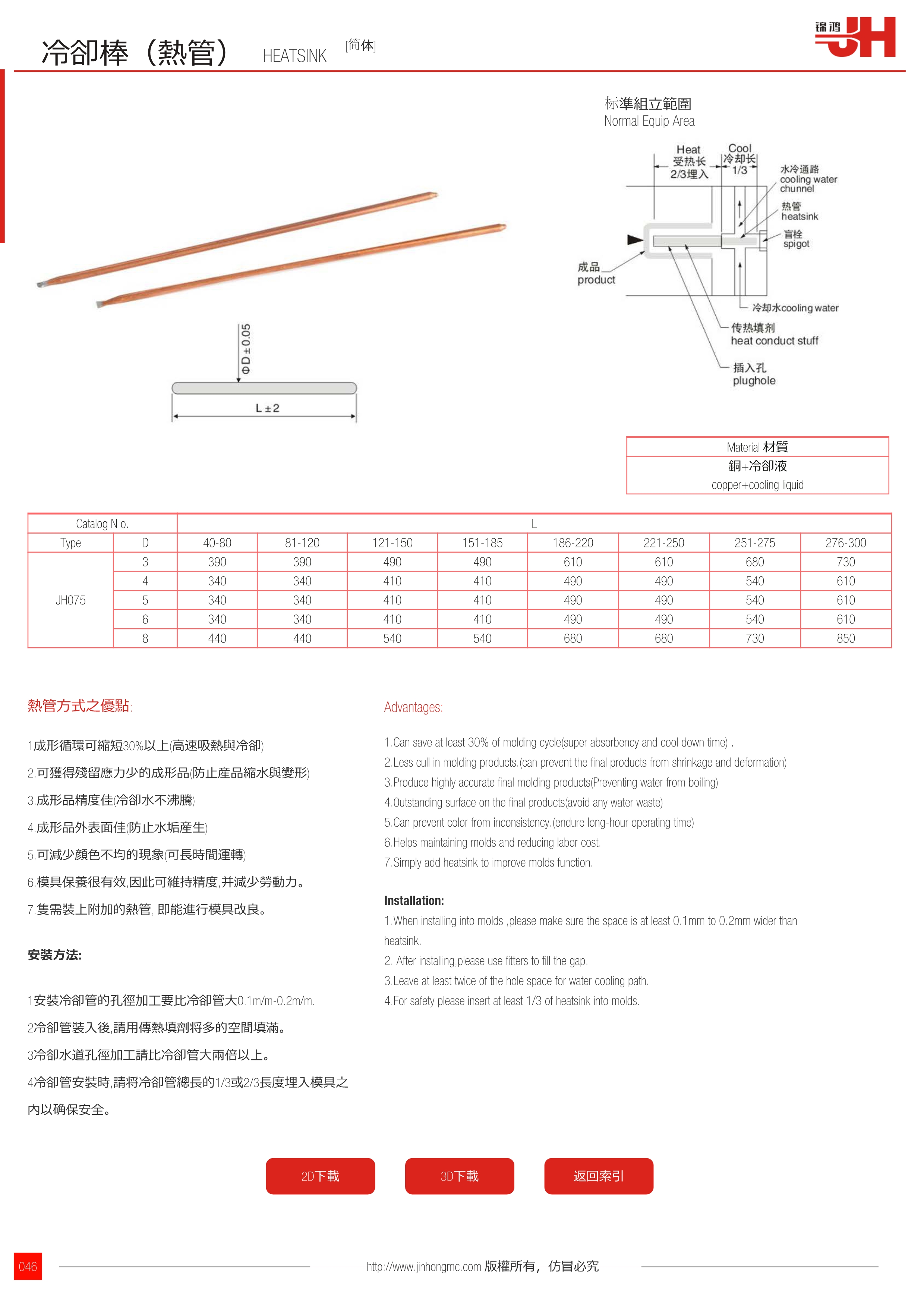 4冷卻管安裝時,請將冷卻管總長的1/3或2/3長度埋入模具之內以確保安全。