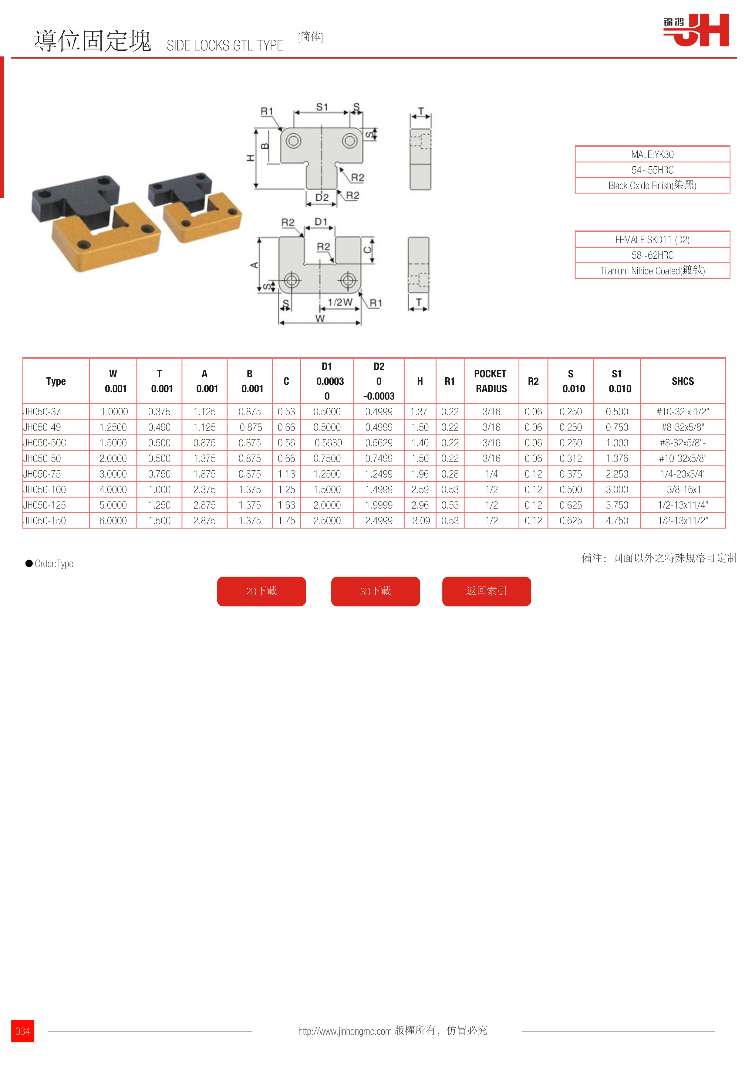 Type | W ±0.001 | T ±0.001 | A ±0.001 | B ±0.001 | C | D1 ±0.0003 0 | D2 0 -0.0003 | H | R1 | POCKET RADIUS | R2 | S ±0.010 | S1 ±0.010 | SHCS |