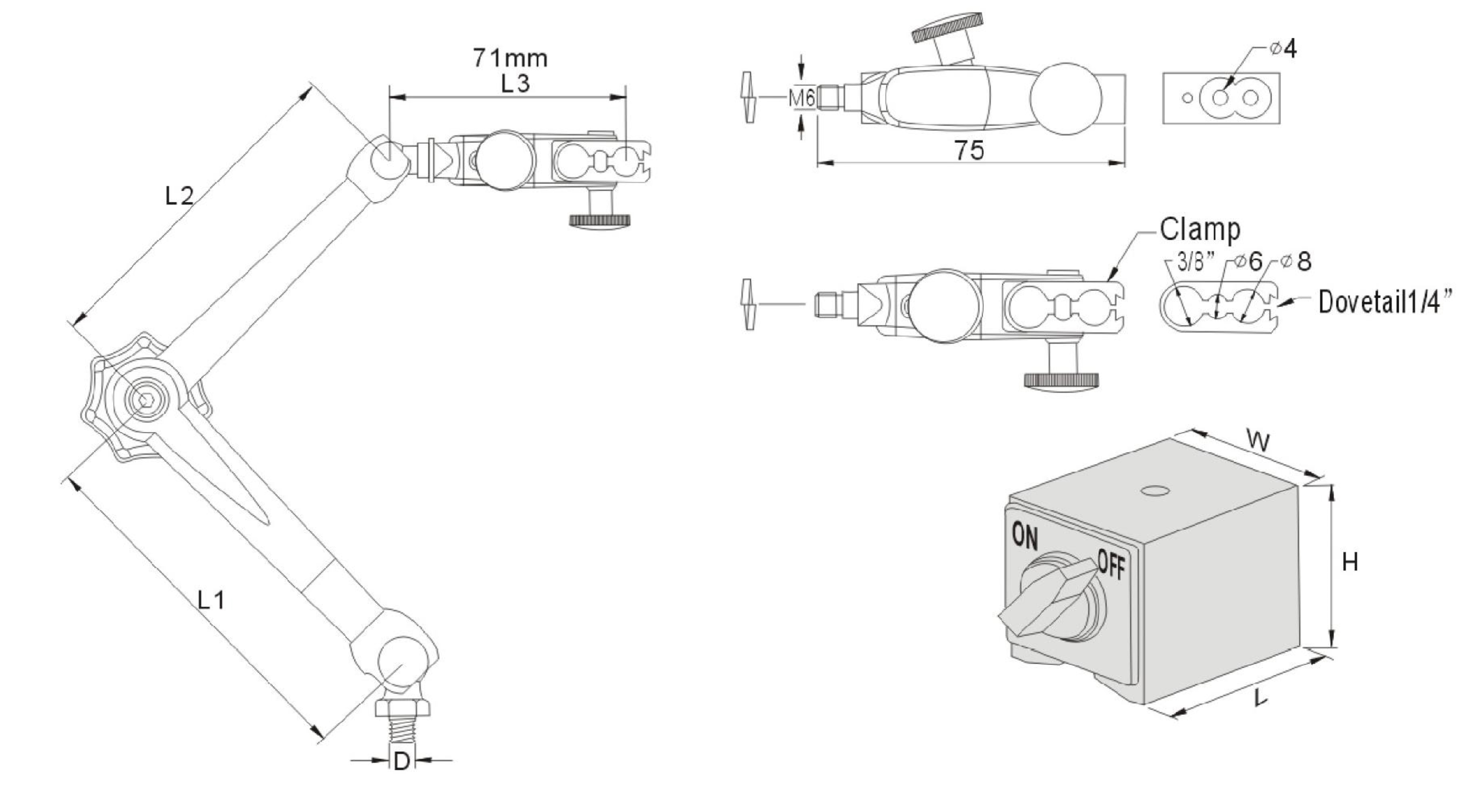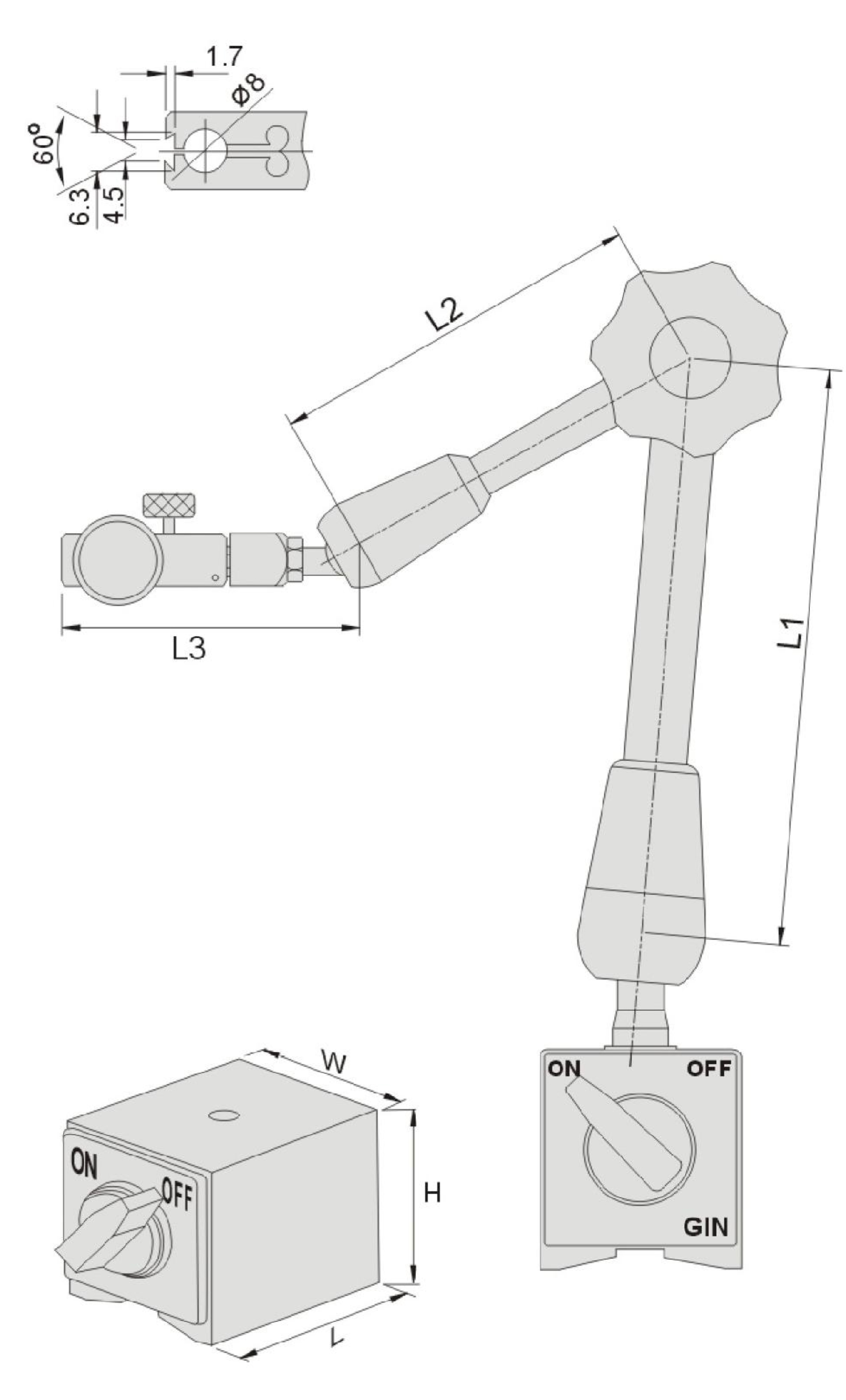 訂購編號 | 型號 | 杠桿規(guī)格 | L3 | 磁性座規(guī)相 | 1 | 吸力(N) | 重量 | ||