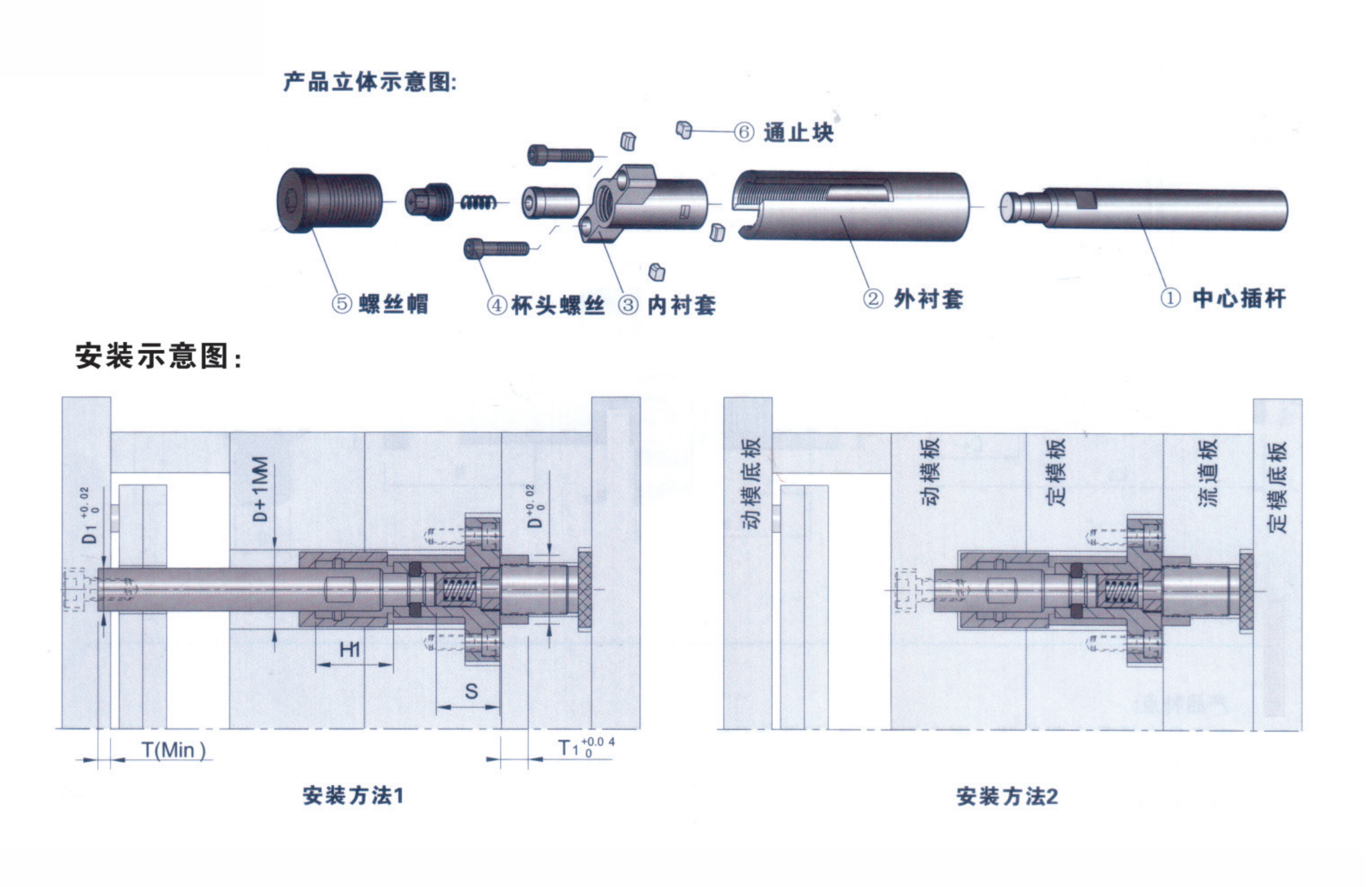 安裝內襯套,用杯頭螺絲將內襯套垂直于分型面固定在定模板上,安裝前需精確計算好第一次開模行程;