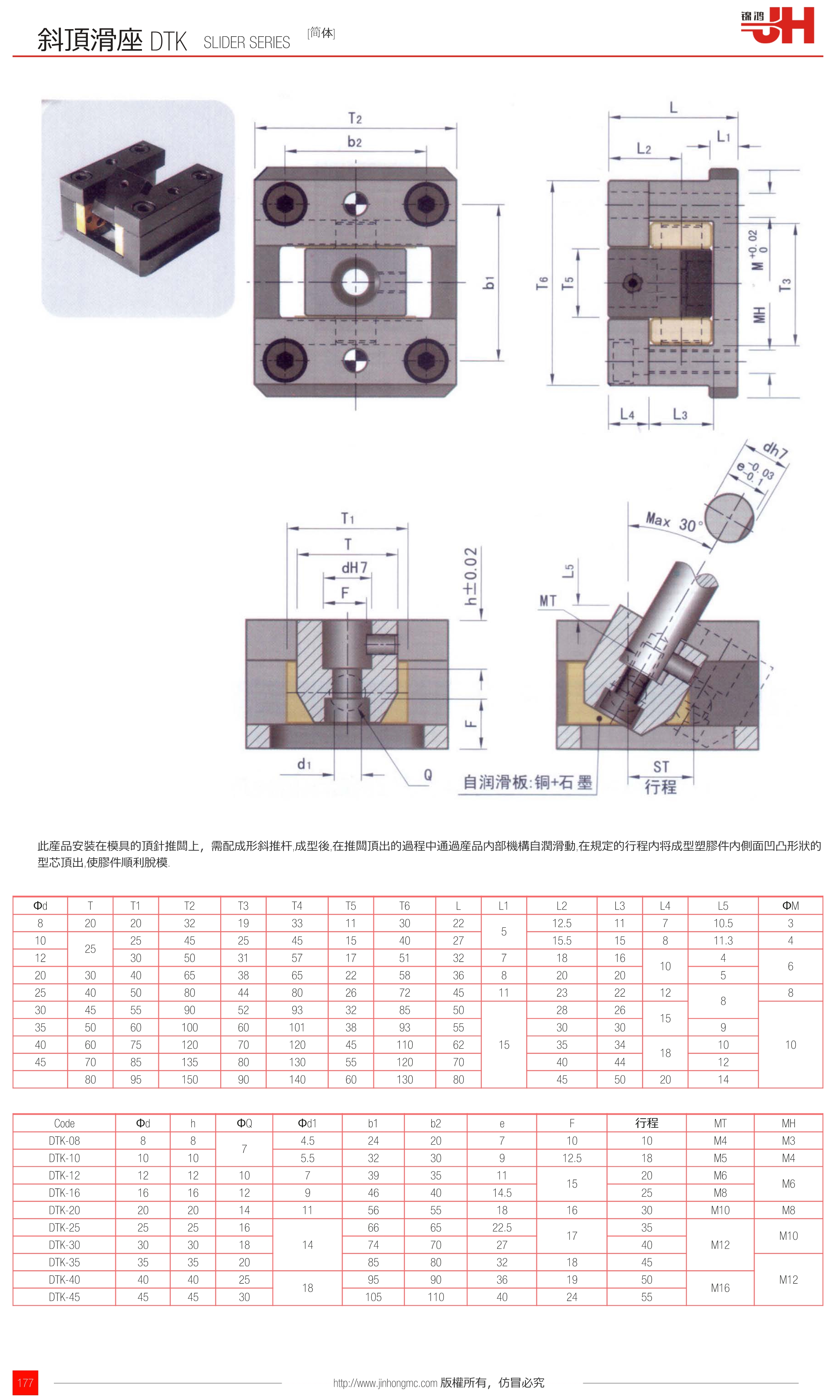 此產(chǎn)品安裝在模具的頂針推板上,需配成形斜推桿,成型后,在推板頂出的過(guò)程中通過(guò)產(chǎn)品內(nèi)部機(jī)構(gòu)自潤(rùn)滑動(dòng),在規(guī)定的行程內(nèi)將成型塑膠件內(nèi)側(cè)面凹凸形狀的型芯頂出,使膠件順利脫模.