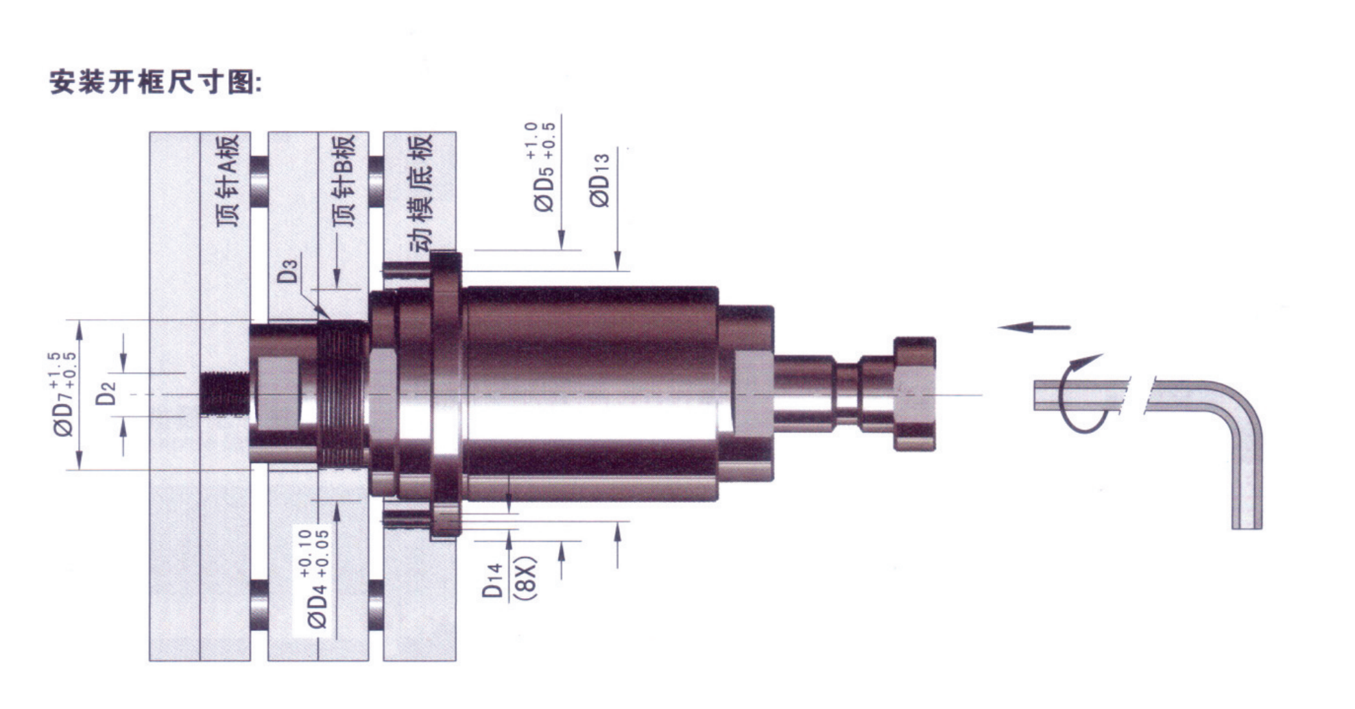 需精準(zhǔn)安裝(一套模具上一般安裝一個(gè)頂出裝置);行程要計(jì)算準(zhǔn)確,否則產(chǎn)品容易損壞。