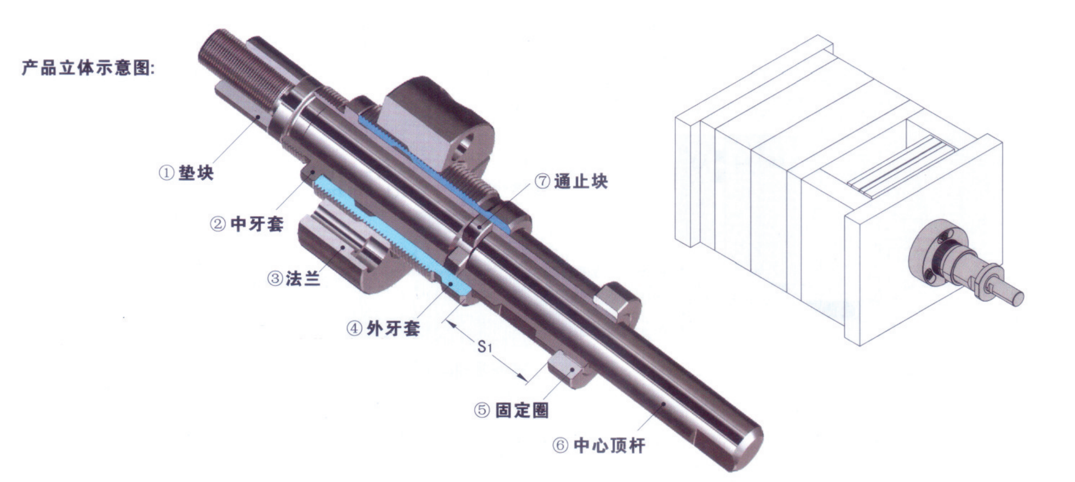 旋轉外牙套,調節外牙套與法蘭的相對位置即可在規定的范圍內設定第一次頂出行程 “S1”的位置,設定后再將法蘭鎖緊;