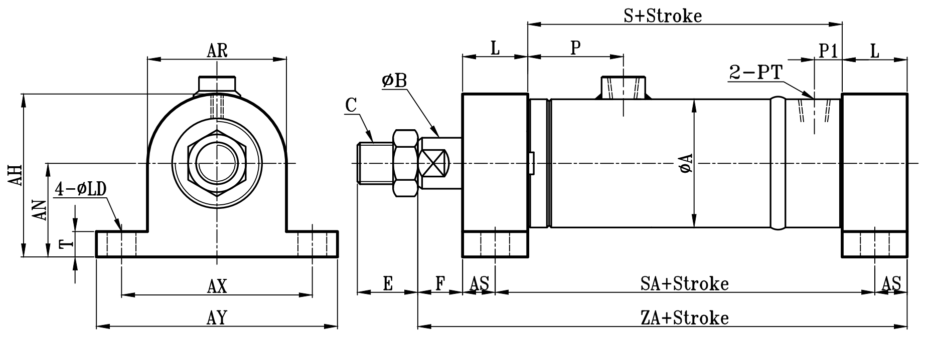 缸徑 BORE | ΦA(chǔ) | ΦB | C | E | F | P | P1 | PT | S | SA | ZA | ΦLD | T | L | AH | AY | AN | AX | AS | AR |