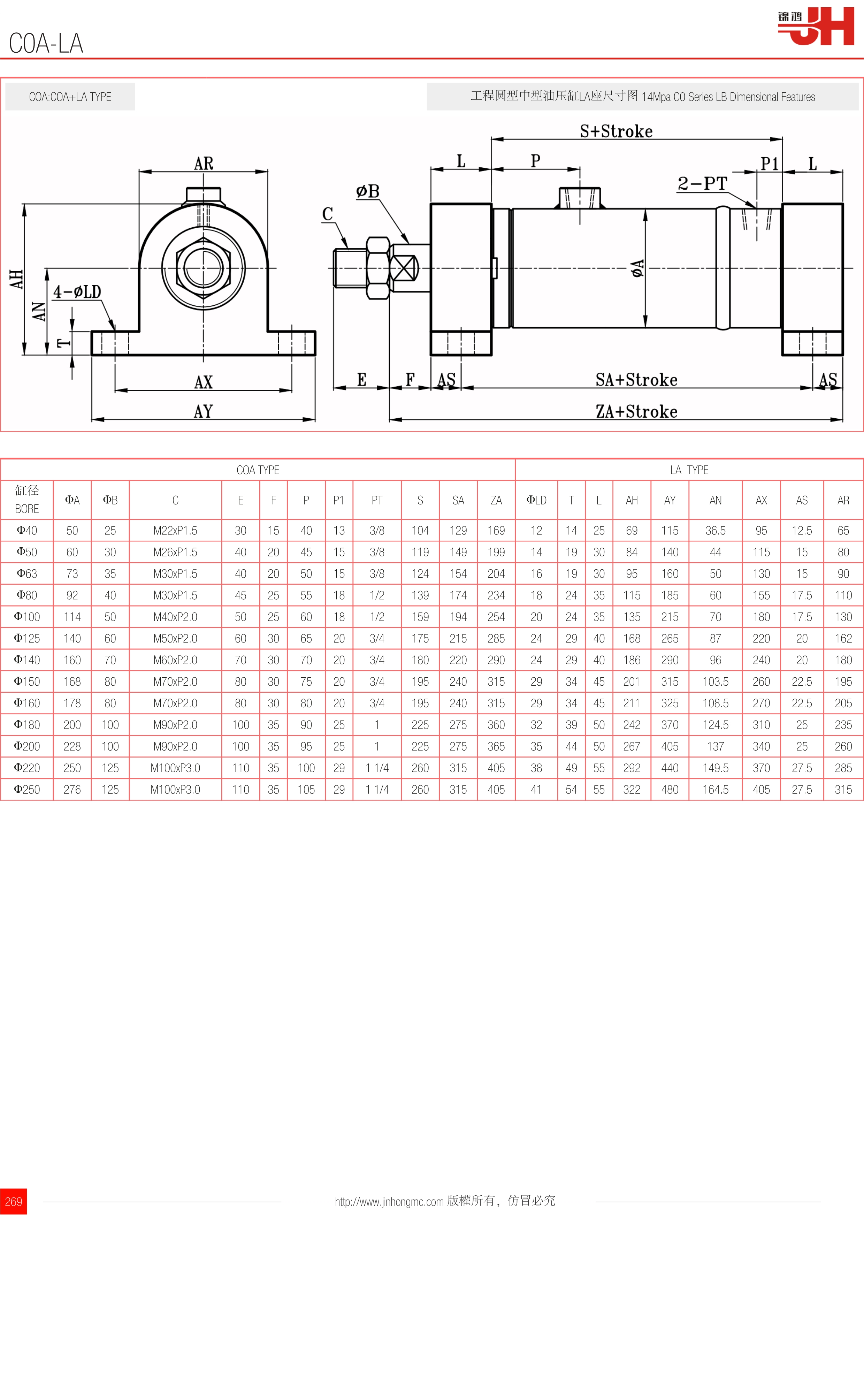 COA:COA+LA TYPE | 工程圓型中型油壓缸LA座尺寸圖 14Mpa C0 Series LA Dimensional Features |