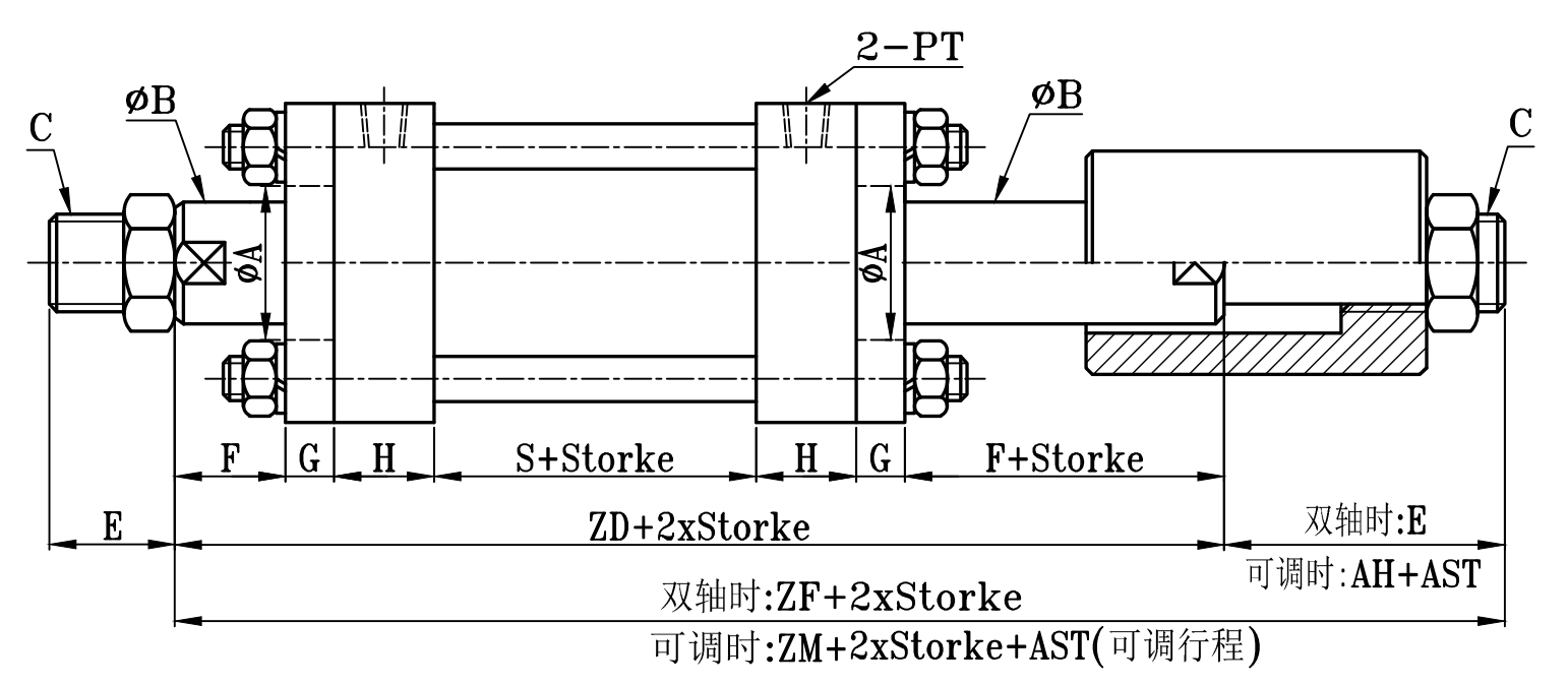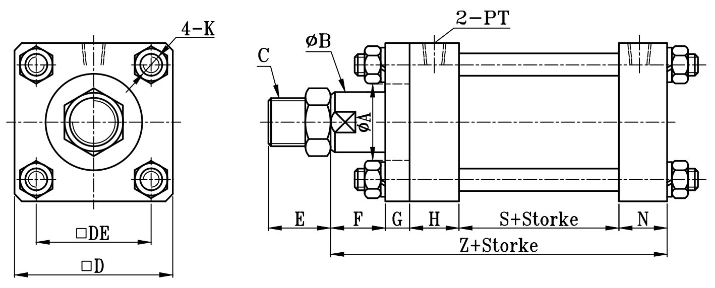 缸徑 BORE | ΦA | ΦB | □ D | □ DE | F | G | H | N | PT | K | S | Z | ZD | ZF | ZM | AH | C | E | J | JH | W | ΦV |