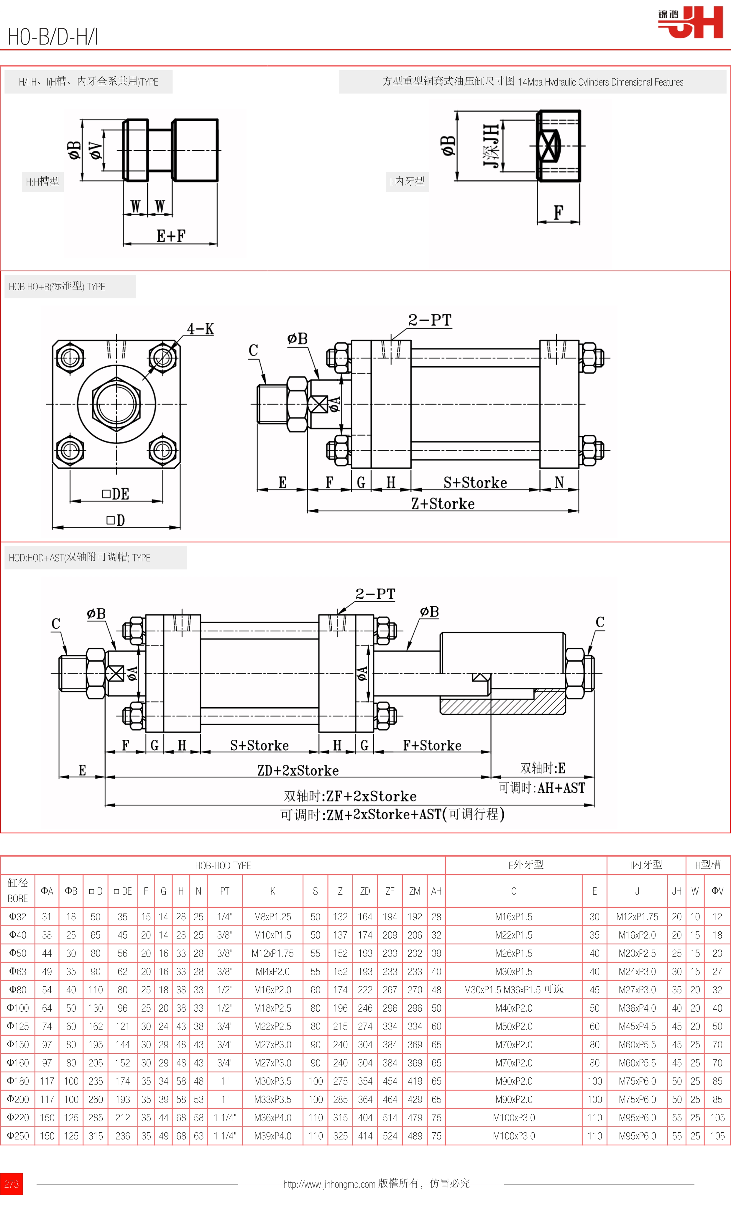 H/I:H、I(H槽、內牙全系共用)TYPE | 方型重型銅套式油壓缸尺寸圖 14Mpa Hydraulic Cylinders Dimensional Features |