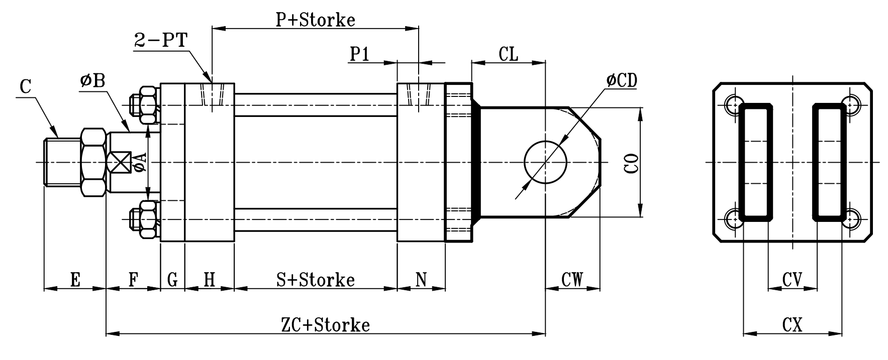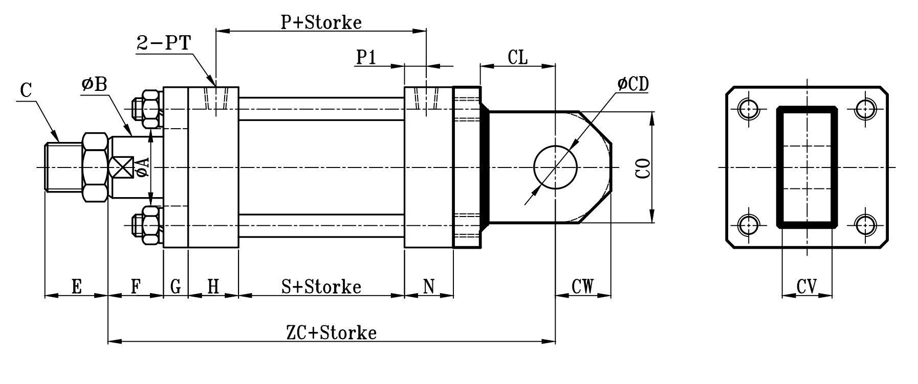 缸徑 BORE | ΦA(chǔ) | ΦB | C | E | F | G | H | N | P | P1 | PT | S | ZC | CL | CW | ΦCD | CO | CV | CX |