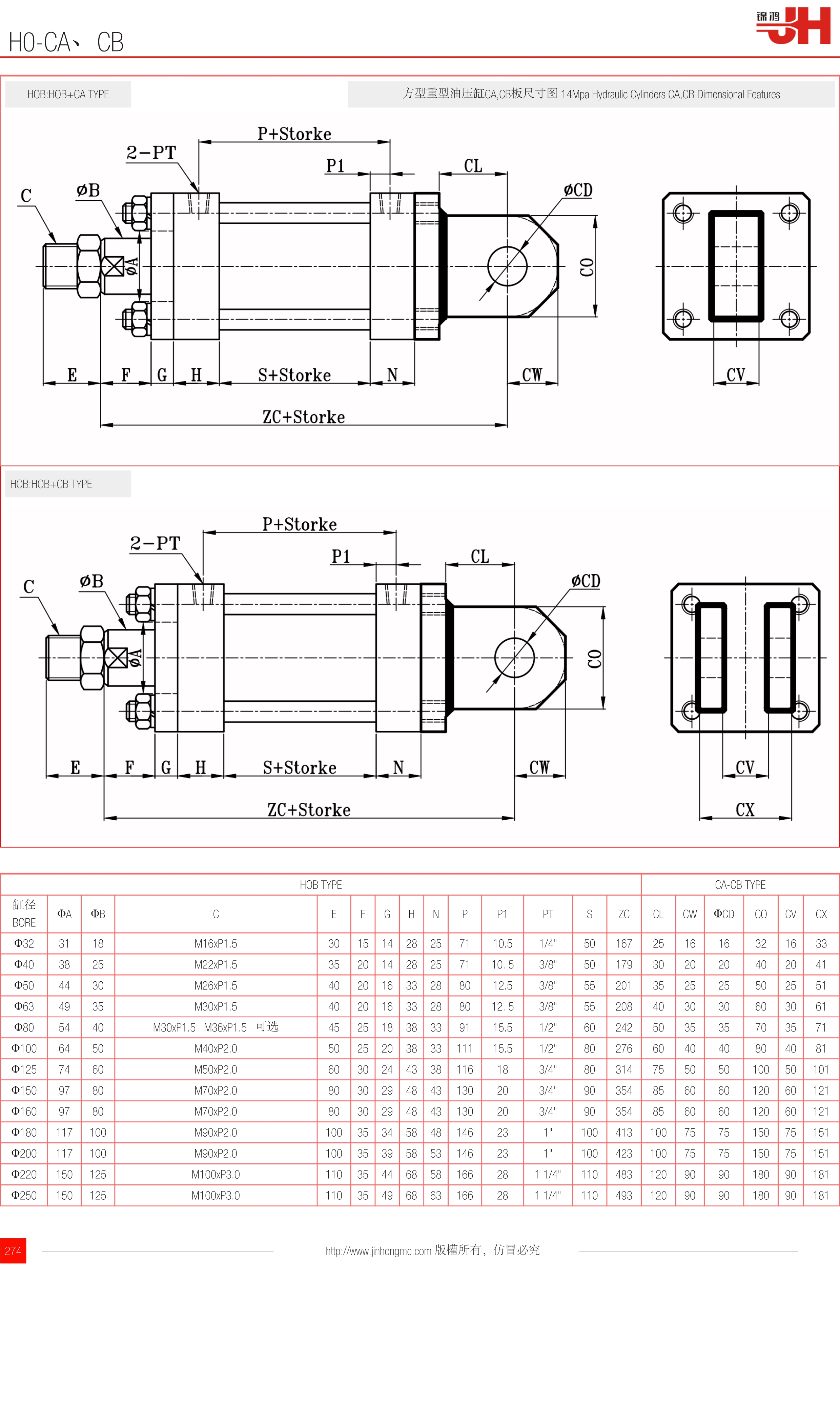 HOB:HOB+CA TYPE | 方型重型油壓缸CA,CB板尺寸圖 14Mpa Hydraulic Cylinders CA,CB Dimensional Features |