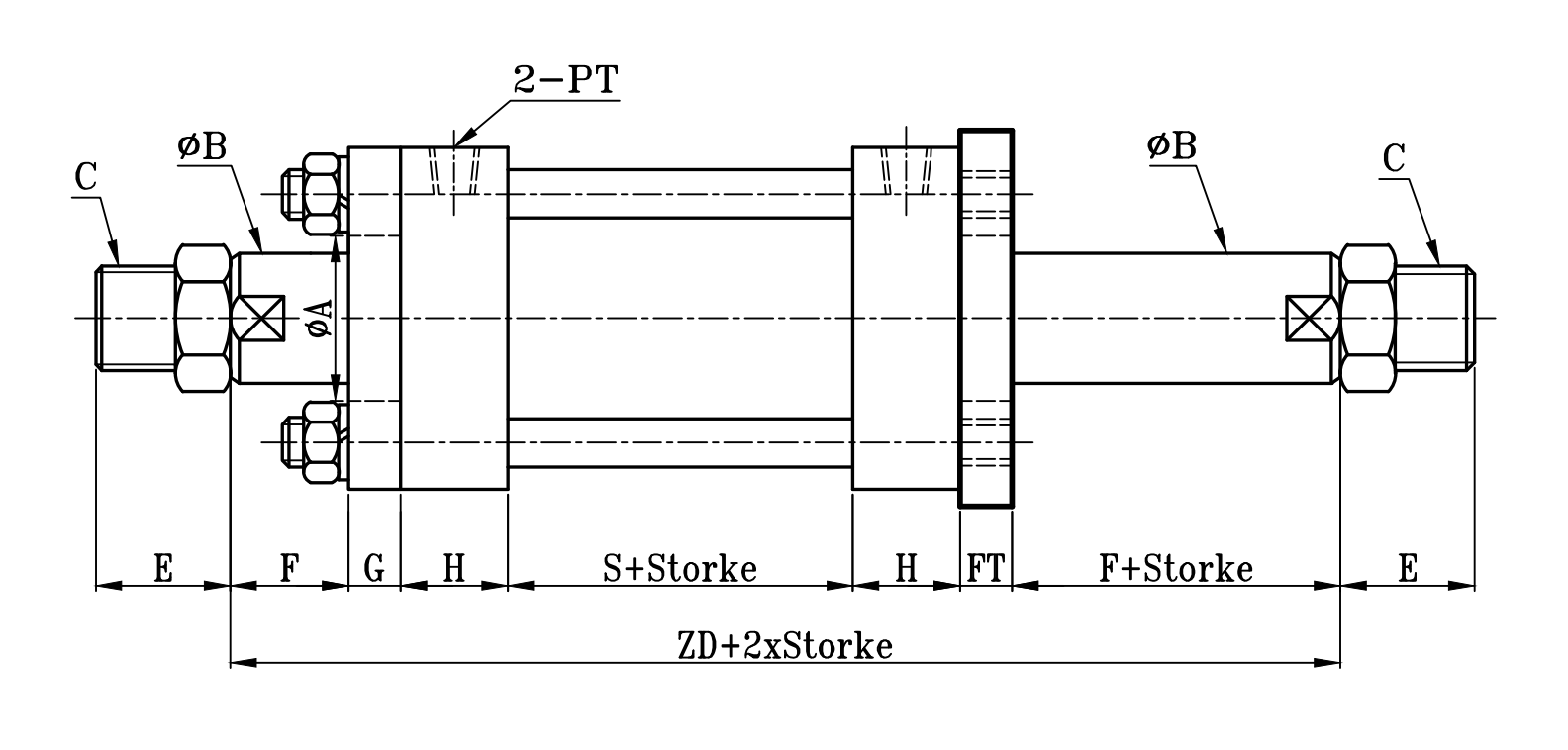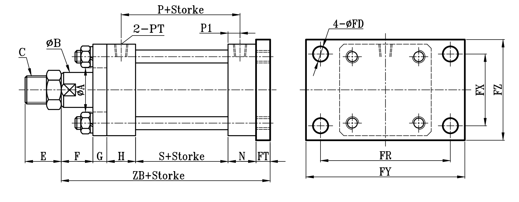 缸徑 BORE | ΦA | ΦB | C | E | F | G | H | N | P | P1 | PT | S | ZB | ZD | ΦFD | FT | FR | FX | FY | FZ |