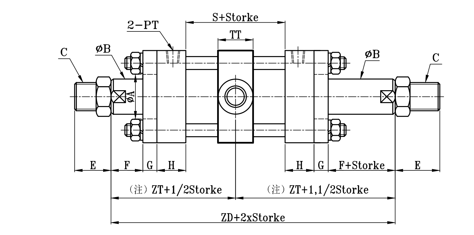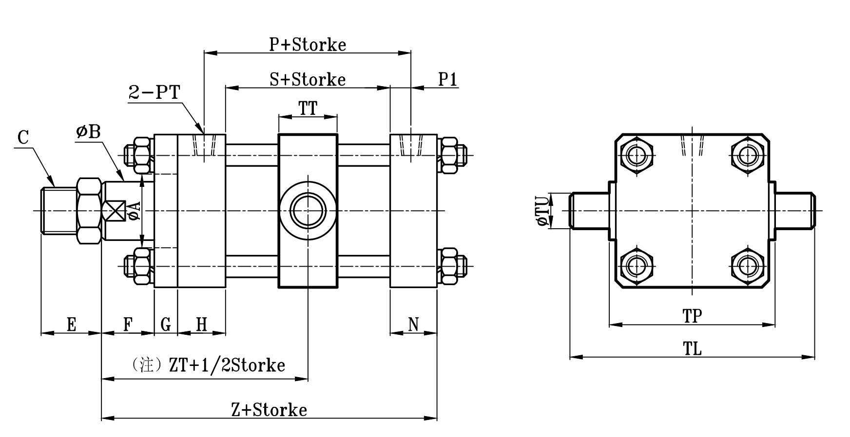缸徑 BORE | ΦA | ΦB | C | E | F | G | H | N | P | P1 | PT | S | Z | ZD | ZT | ΦTU | TL | TP | TT |