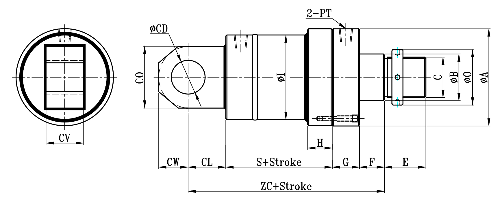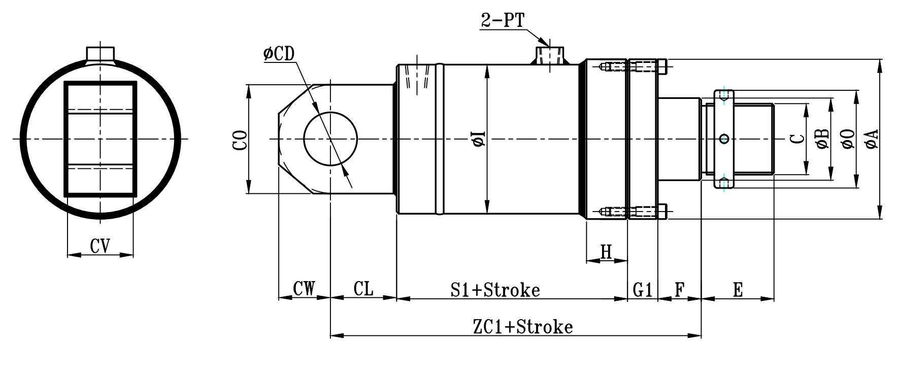 缸徑 BORE | ΦA | ΦB | C | H | ΦI | Φ0 | E | F | G | G1 | S | S1 | ZC | ZC1 | ΦCD | CV | CW | CL | CO | PT |