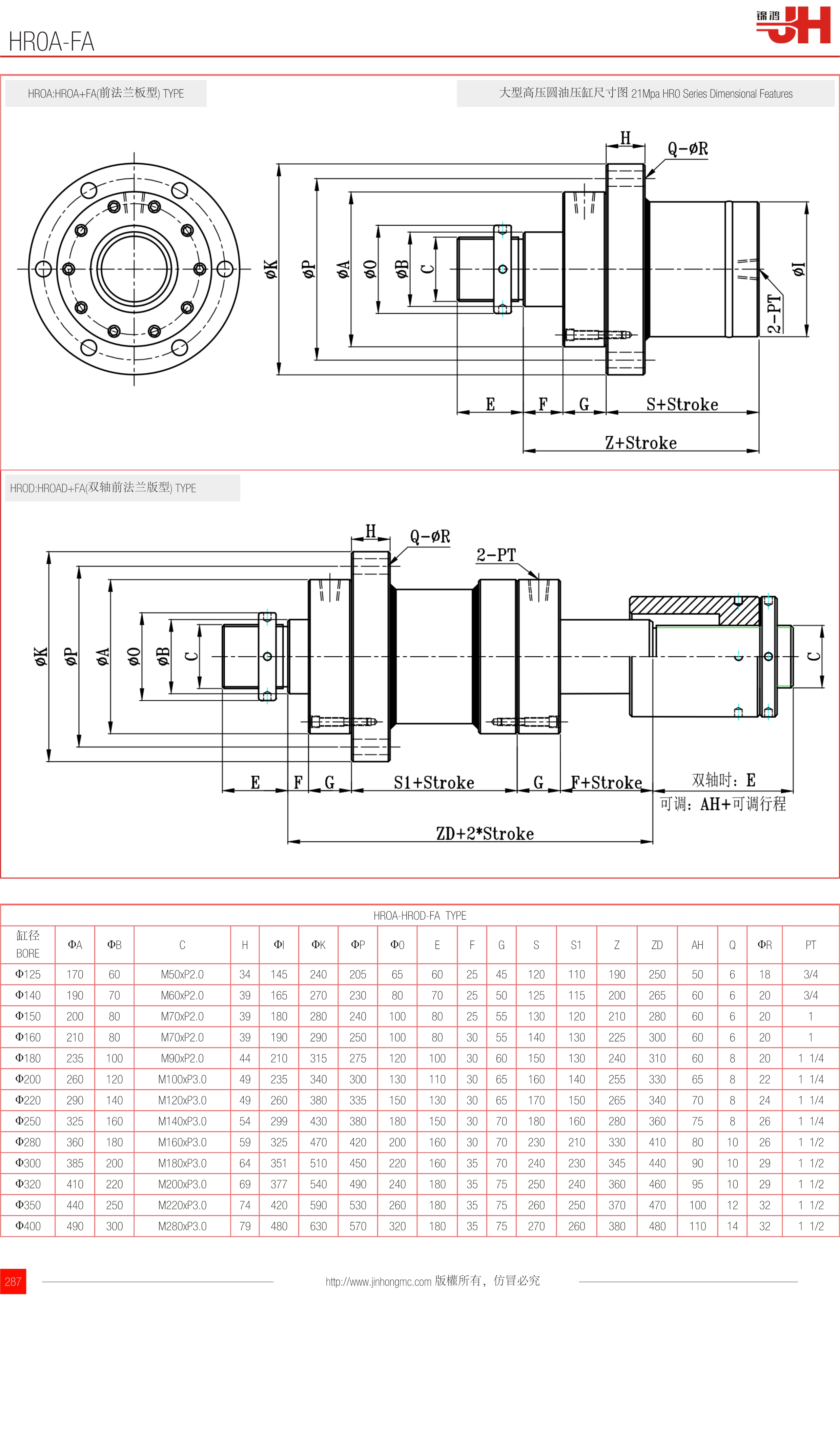 HROA:HROA+FA(前法蘭板型) TYPE | 大型高壓圓油壓缸尺寸圖 21Mpa HR0 Series Dimensional Features |