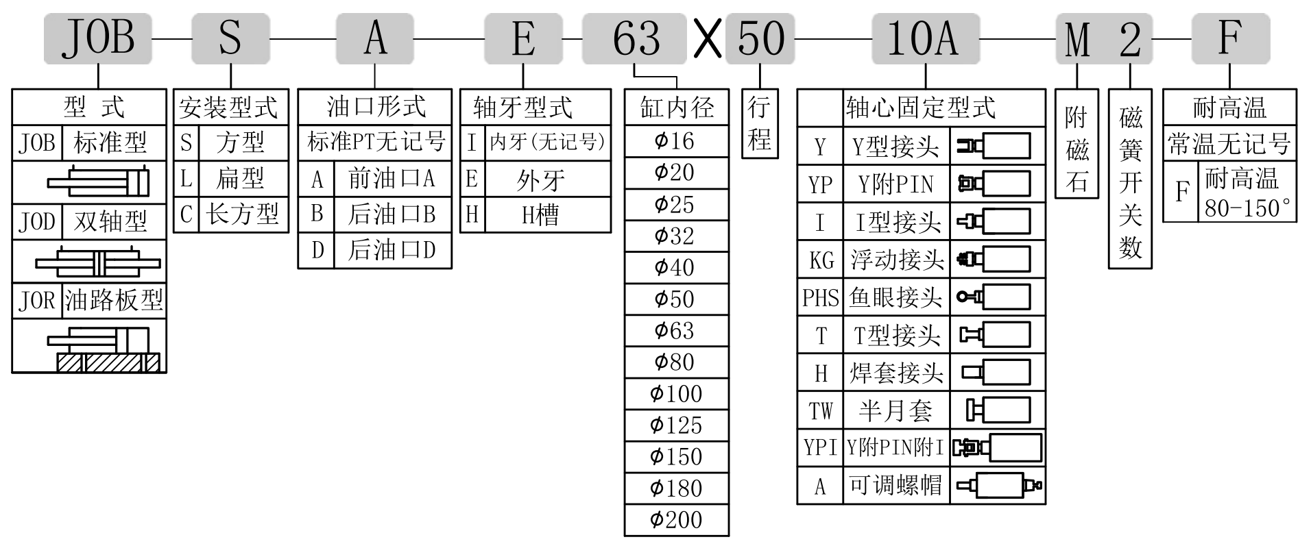 油壓缸內徑 Bore sizes of cy linder(mm) | Φ16、Φ20、Φ25、Φ32、Φ40、Φ50、Φ63、Φ80、Φ100、Φ125、Φ150、Φ180、Φ200 |