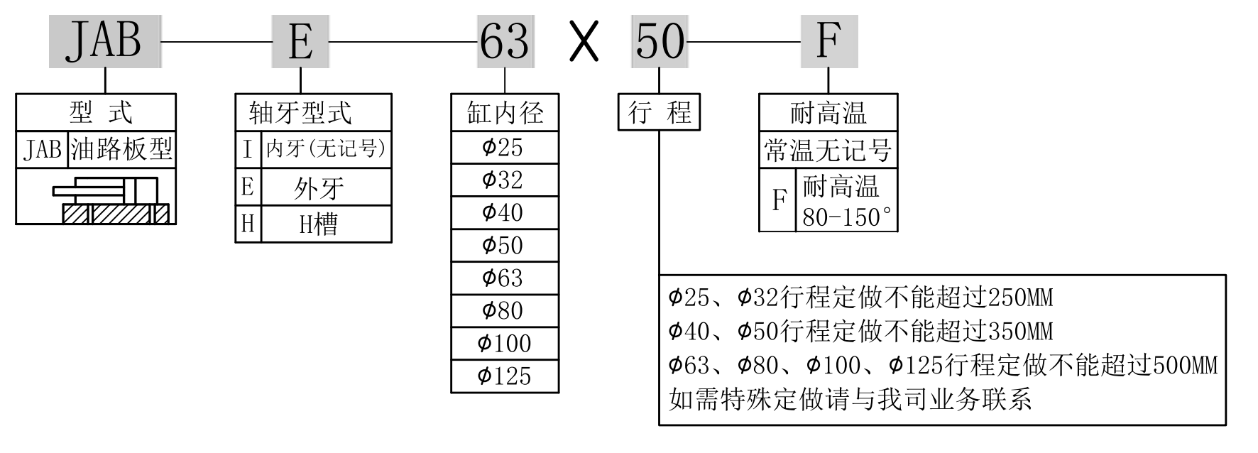 油壓缸內徑 Bore sizes of cy linder(mm) | Φ25、Φ32、Φ40、Φ50、Φ63、Φ80、Φ100、Φ125 |