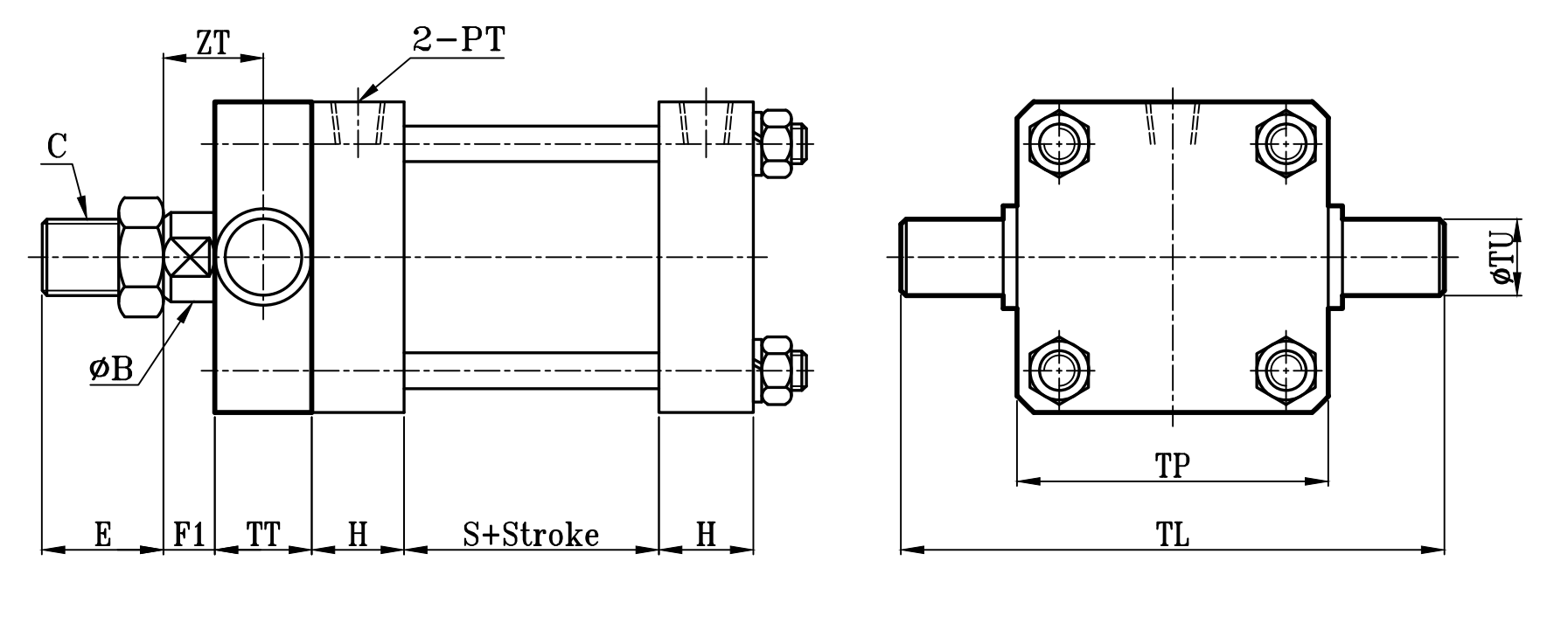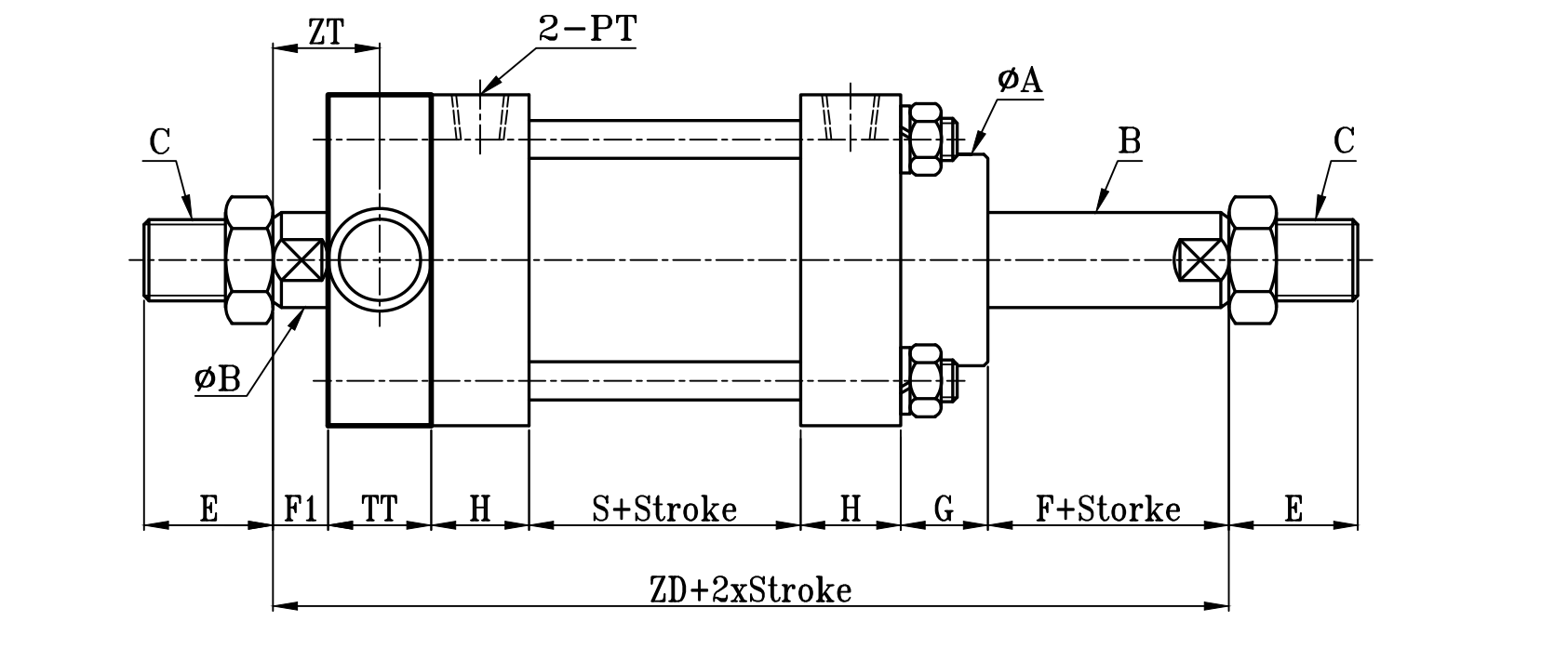缸徑 BORE | ΦA(chǔ) | ΦB | C | E | F | F1 | G | H | PT | S | ZT | ZD | TL | TP | TT | ΦTU |