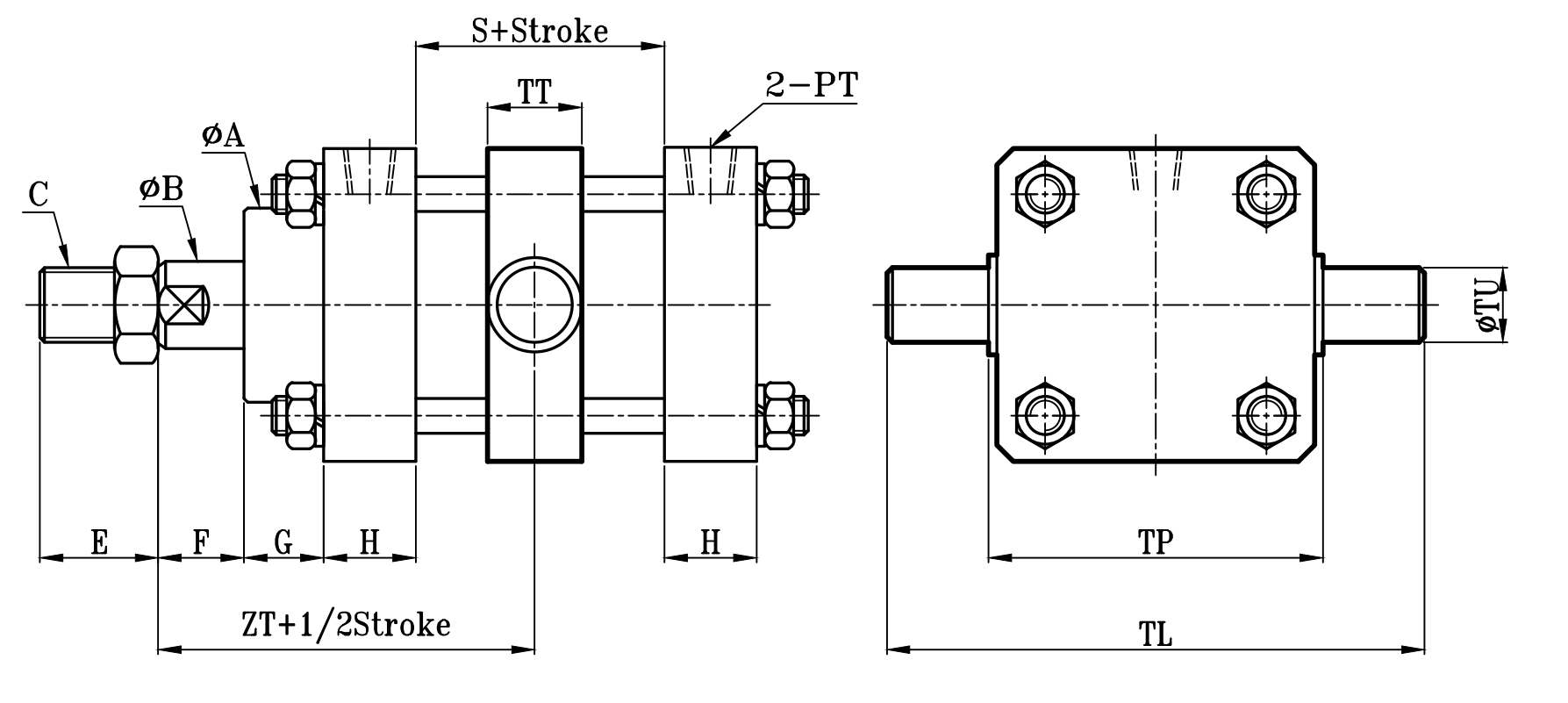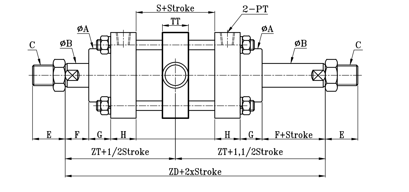 缸徑 BORE | ΦA | ΦB | C | E | F | G | H | PT | S | ZD | ZT | TL | TP | TT | ΦTU |