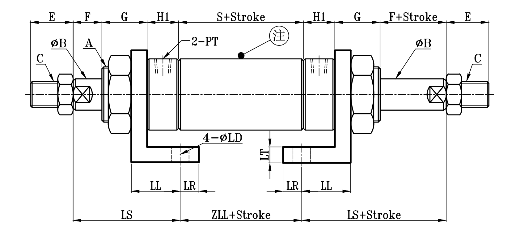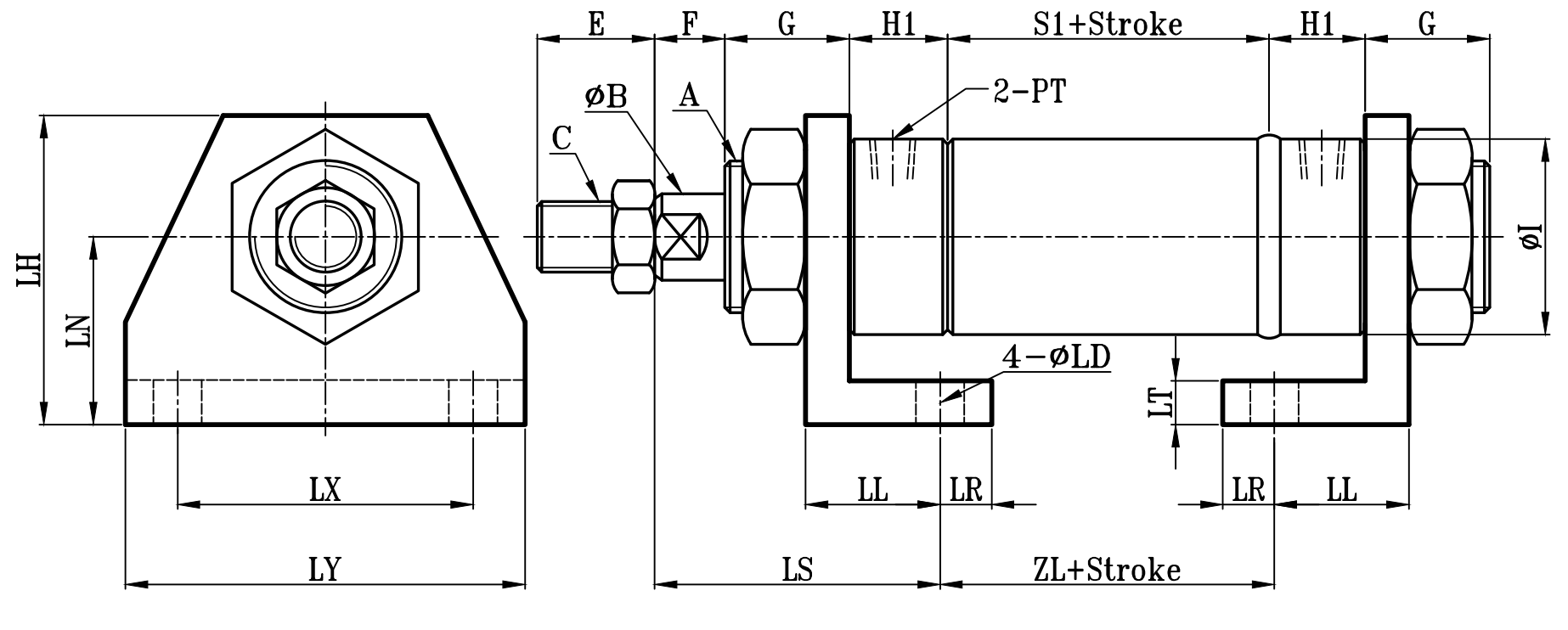 缸徑 BORE | A | ΦB | C | E | F | G | H1 | ΦI | PT | S1 | S | LS | ZL | ZLL | ΦLD | LH | LN | LL | LR | LT | LX | LY |