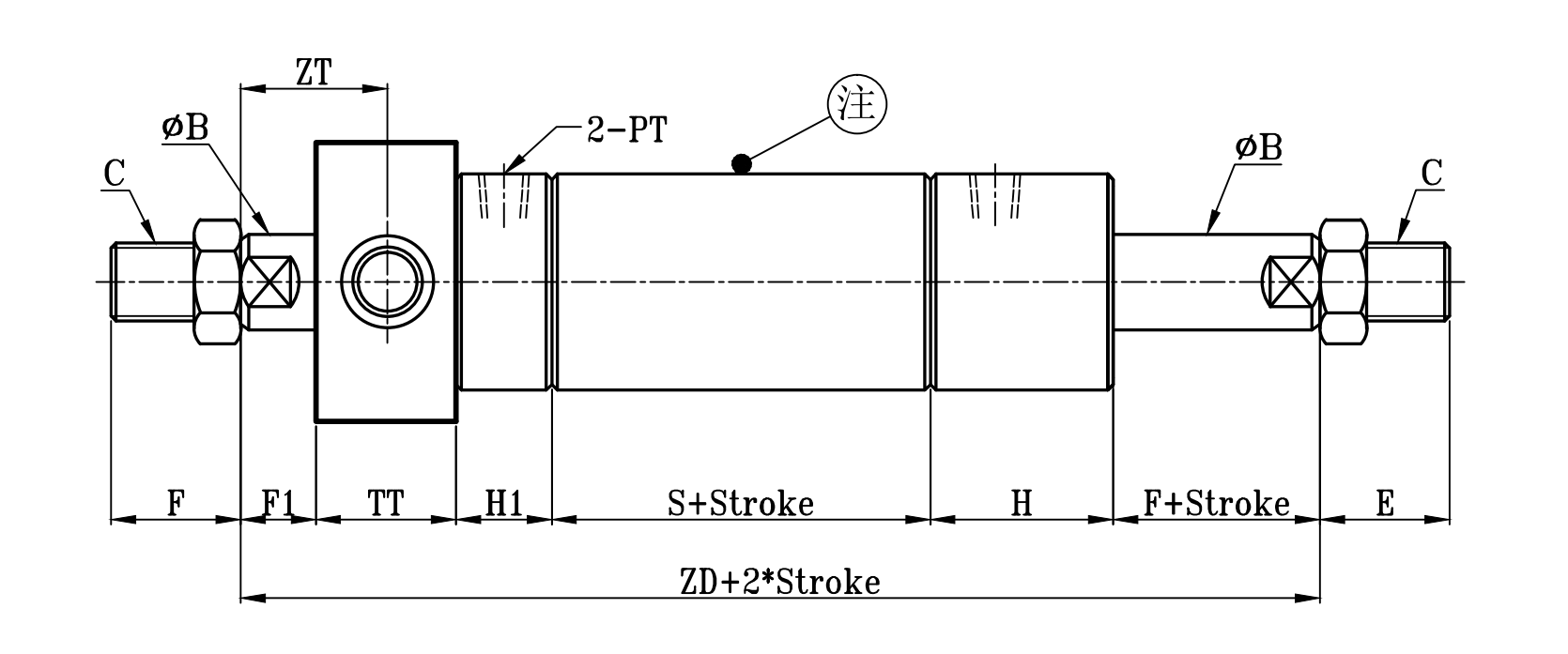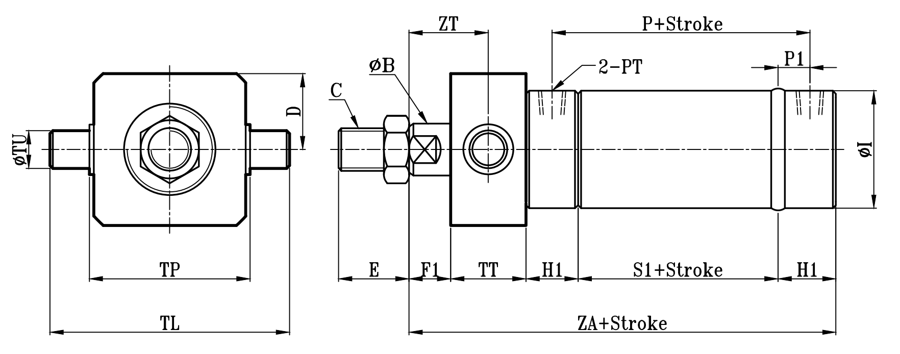 缸徑 BORE | ΦB | C | E | F | F1 | H1 | H | ΦI | P | P1 | PT | S1 | S | ZA | ZD | ZT | ΦTU | TL | TP | TT | D |