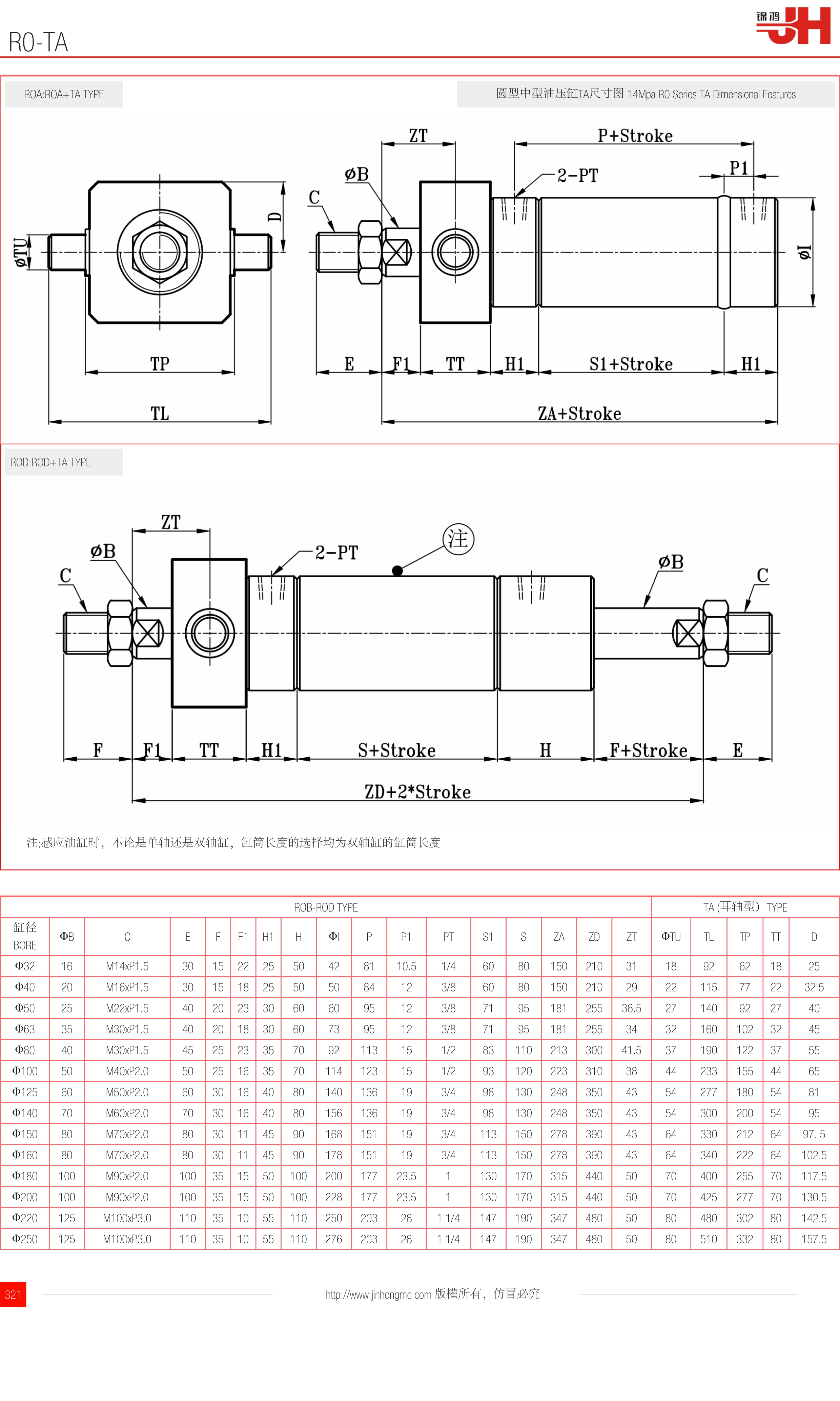 ROA:ROA+TA TYPE | 圓型中型油壓缸TA尺寸圖 14Mpa R0 Series TA Dimensional Features |