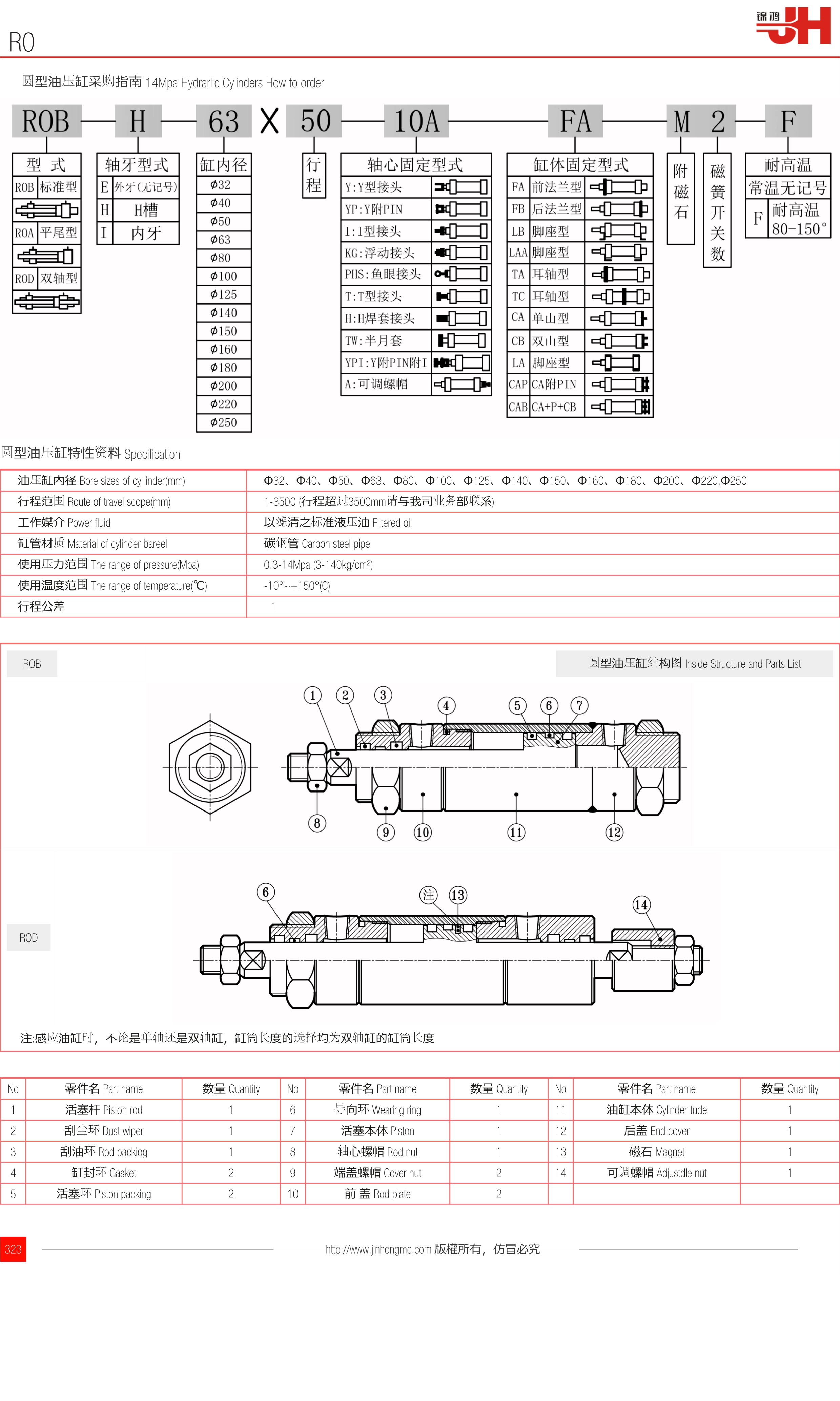 油壓缸內徑 Bore sizes of cy linder(mm) | Φ32、Φ40、Φ50、Φ63、Φ80、Φ100、Φ125、Φ140、Φ150、Φ160、Φ180、Φ200、Φ220,Φ250 |