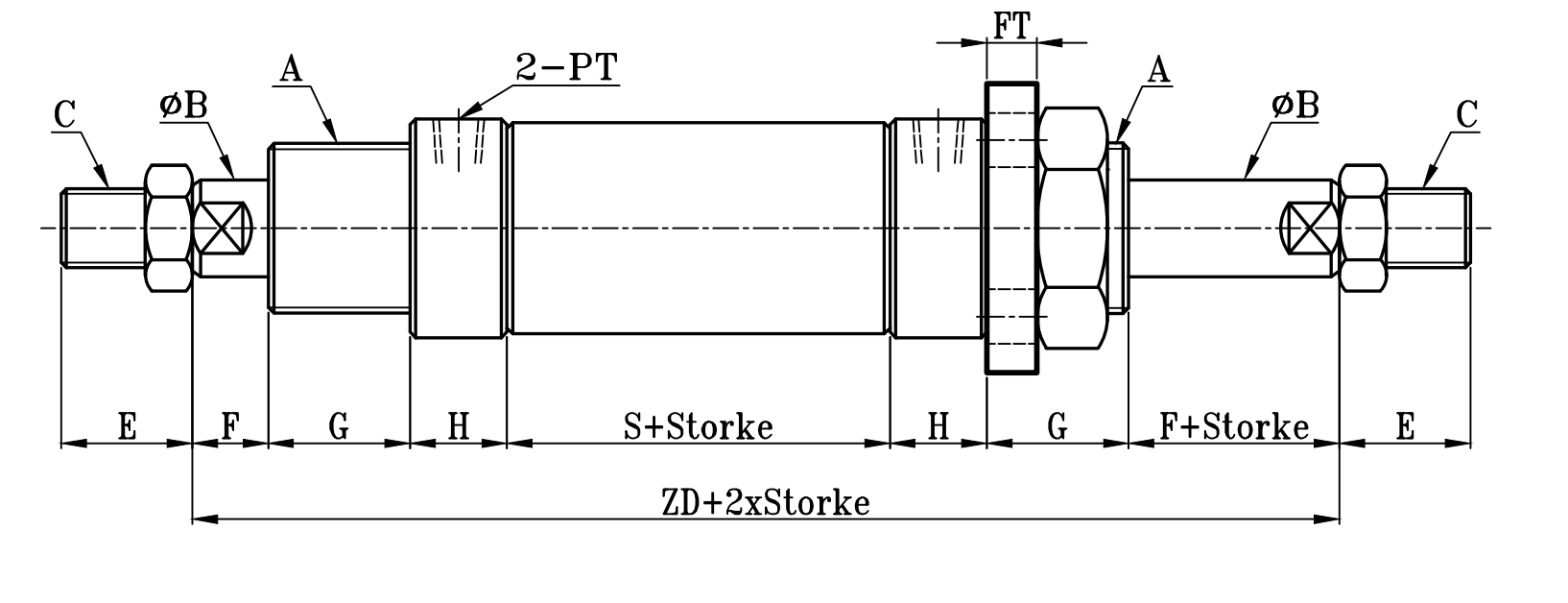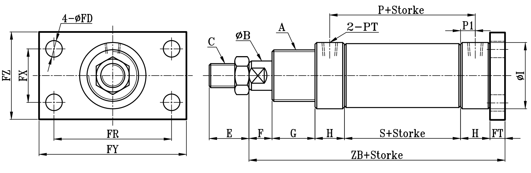 缸徑 BORE | A | ΦB | C | E | F | G | H | ΦI | P | P1 | PT | S | ZB | ZD | ΦFD | ΦFK | FT | FR | FX | FY | FZ | ΦP | Φ0 |