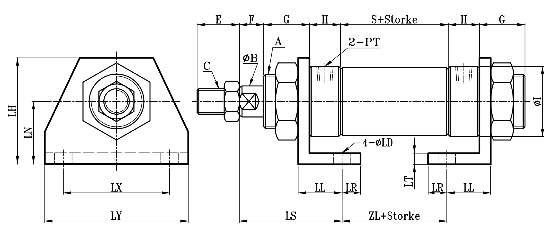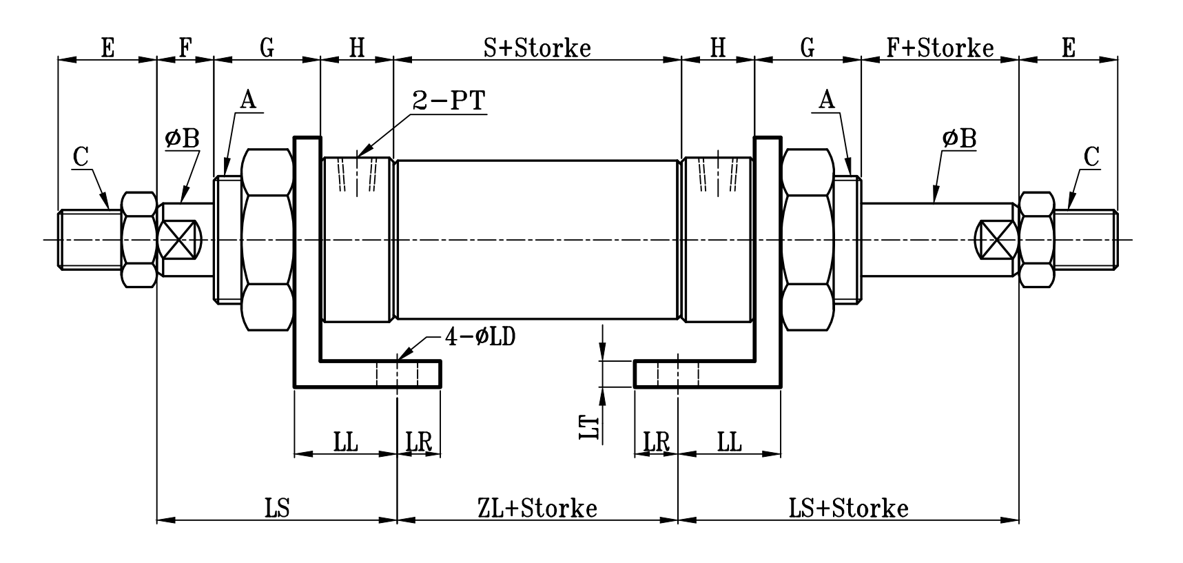 缸徑 BORE | A | ΦB | C | E | F | G | H | ΦI | PT | S | LS | ZL | ΦLD | LH | LN | LL | LR | LT | LX | LY |
