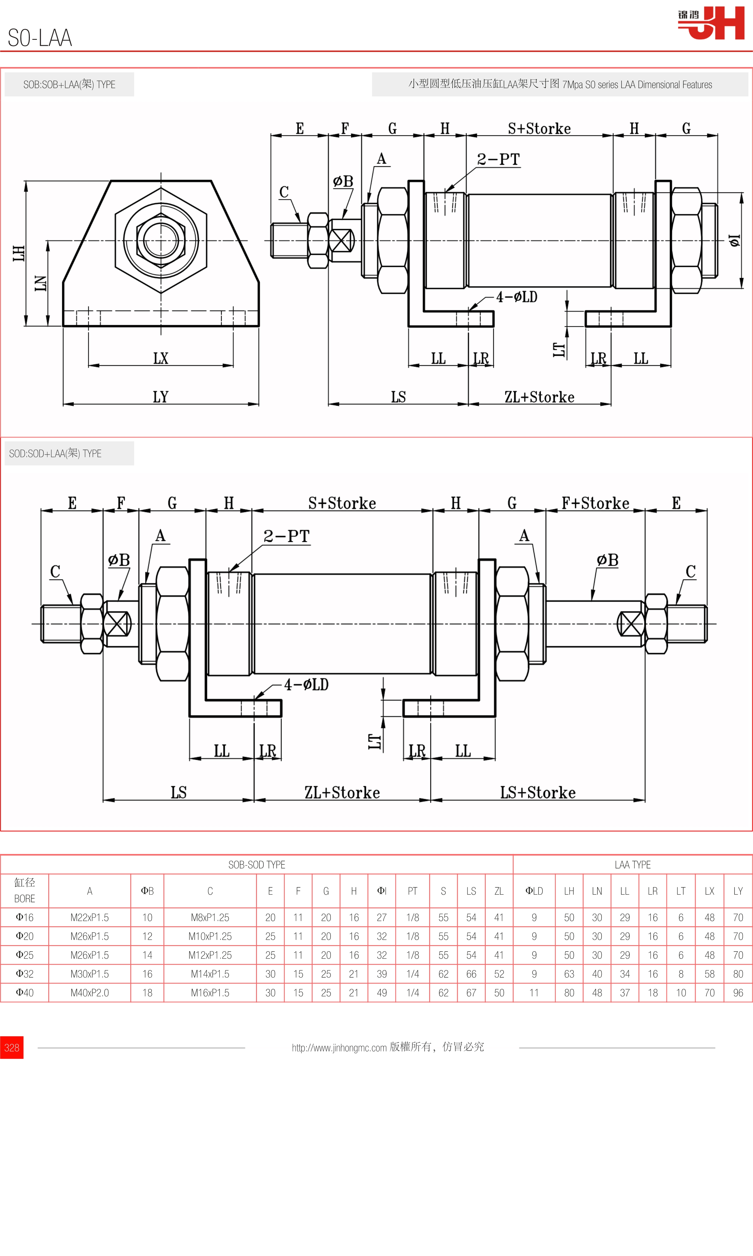 SOB:SOB+LAA(架) TYPE | 小型圓型低壓油壓缸LAA架尺寸圖 7Mpa S0 series LAA Dimensional Features |