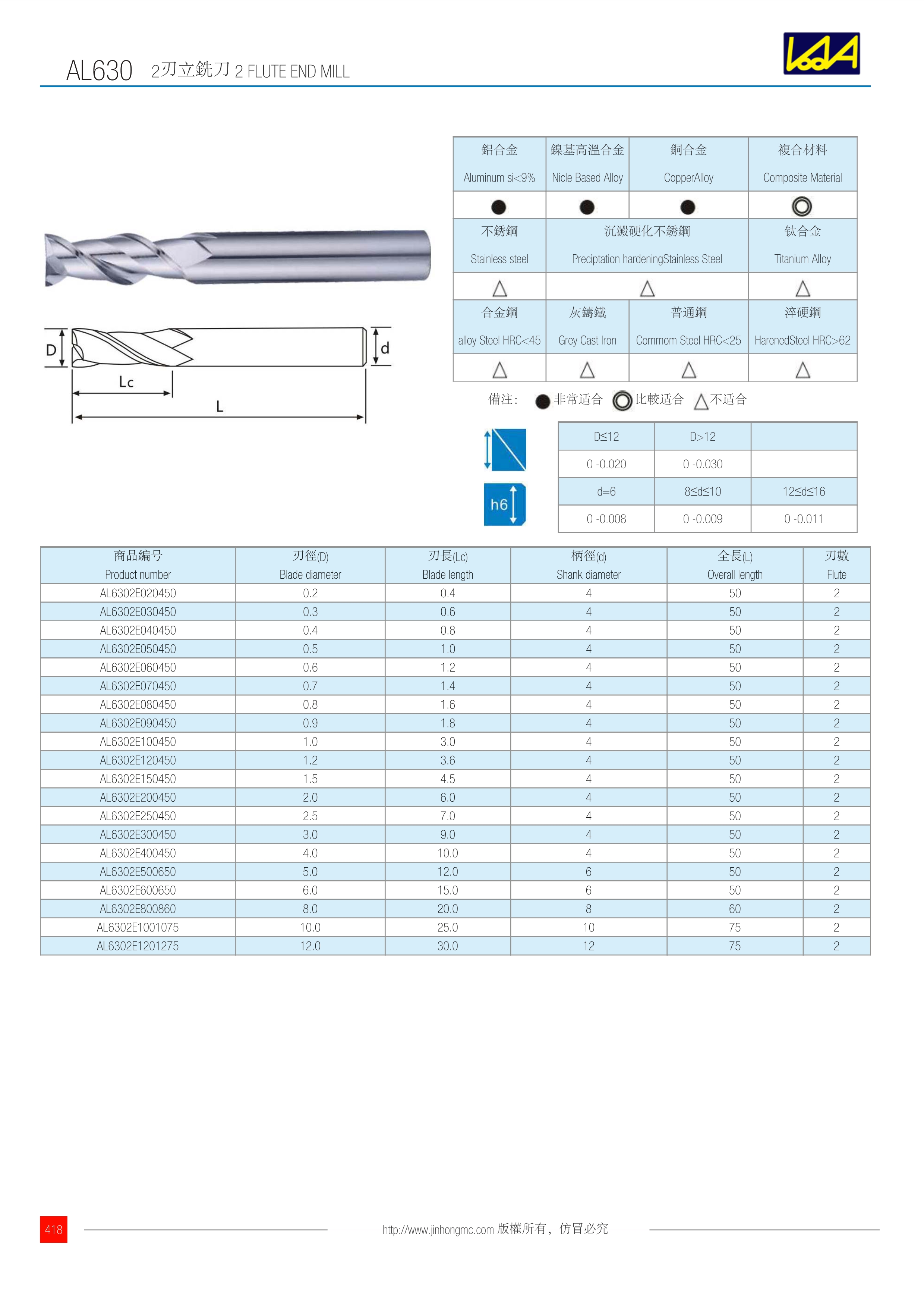 商品編號(hào) Product number | 刃徑(D) Blade diameter | 刃長(Lc) Blade length | 柄徑(d) Shank diameter | 全長(L) Overall length | 刃數(shù) Flute |