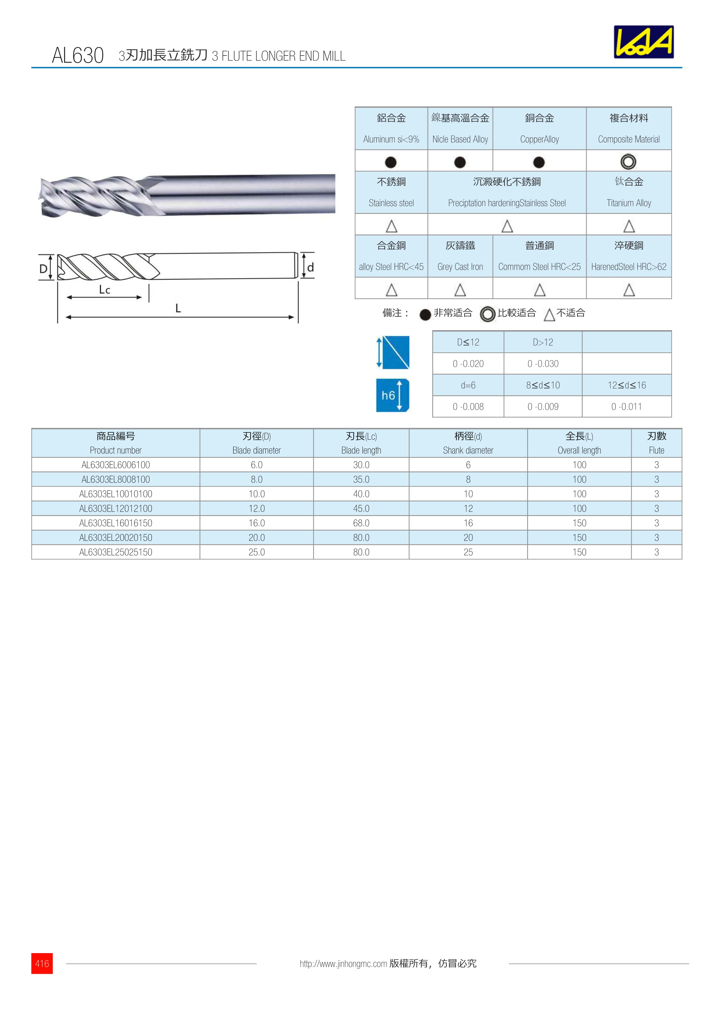 商品編號 Product number | 刃徑(D) Blade diameter | 刃長(Lc) Blade length | 柄徑(d) Shank diameter | 全長(L) Overall length | 刃數 Flute |