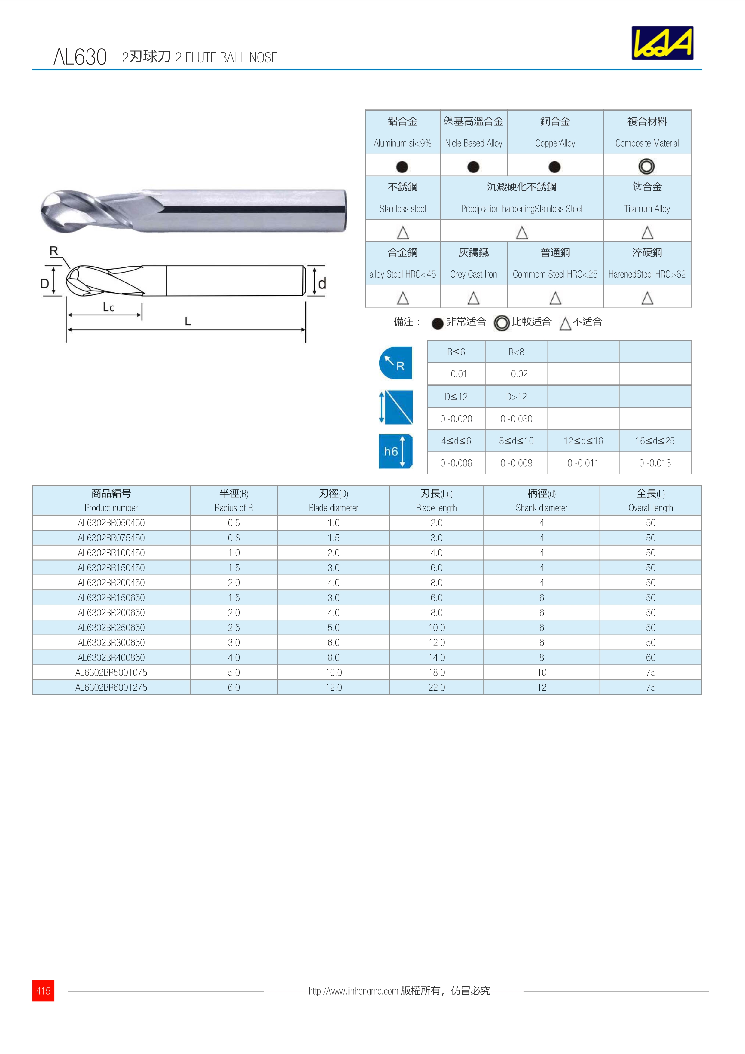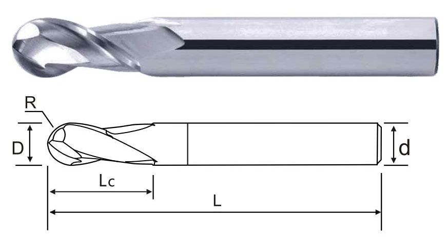 商品編號 Product number | 半徑(R) Radius of R | 刃徑(D) Blade diameter | 刃長(Lc) Blade length | 柄徑(d) Shank diameter | 全長(L) Overall length |