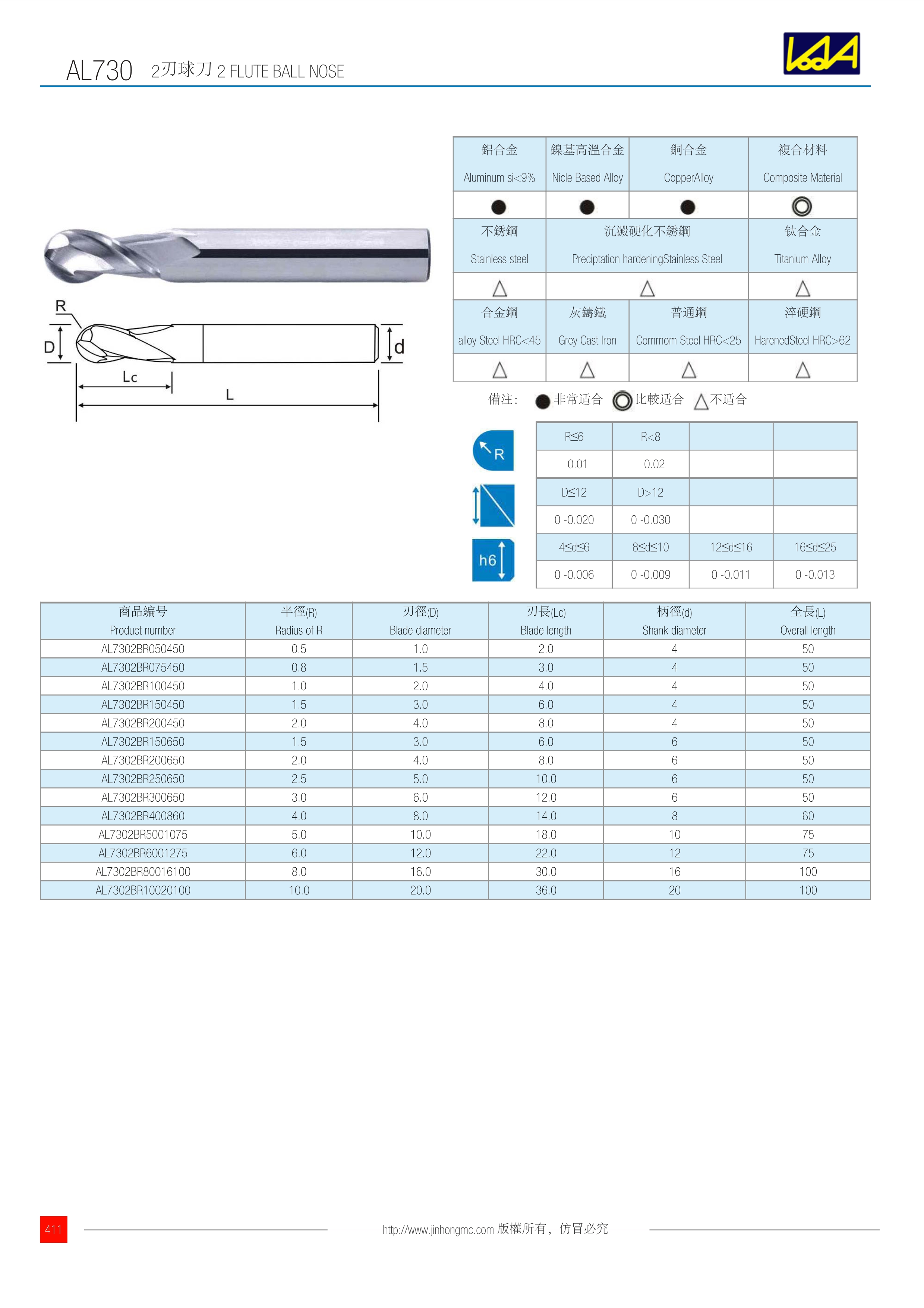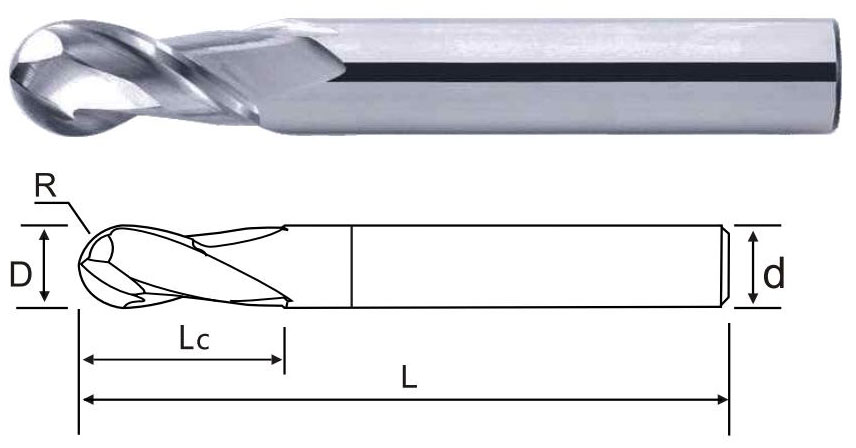 商品編號 Product number | 半徑(R) Radius of R | 刃徑(D) Blade diameter | 刃長(Lc) Blade length | 柄徑(d) Shank diameter | 全長(L) Overall length |