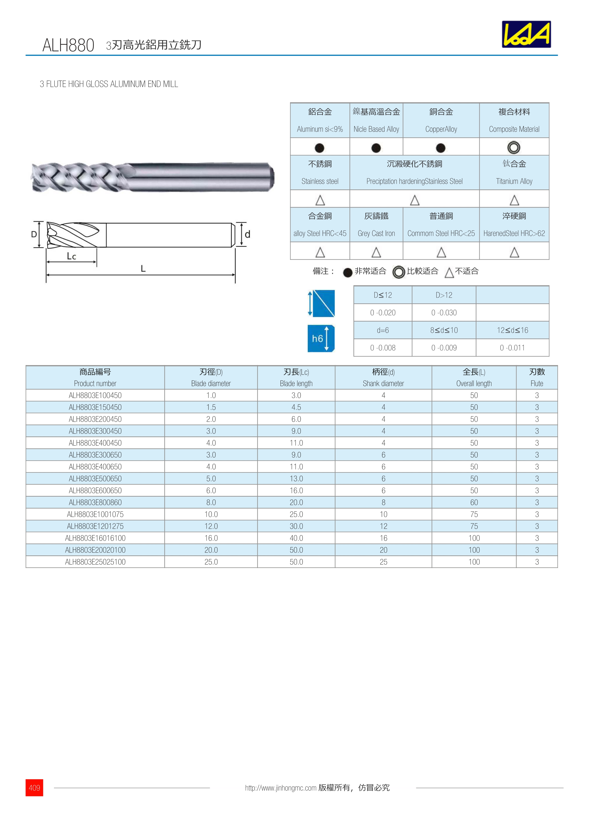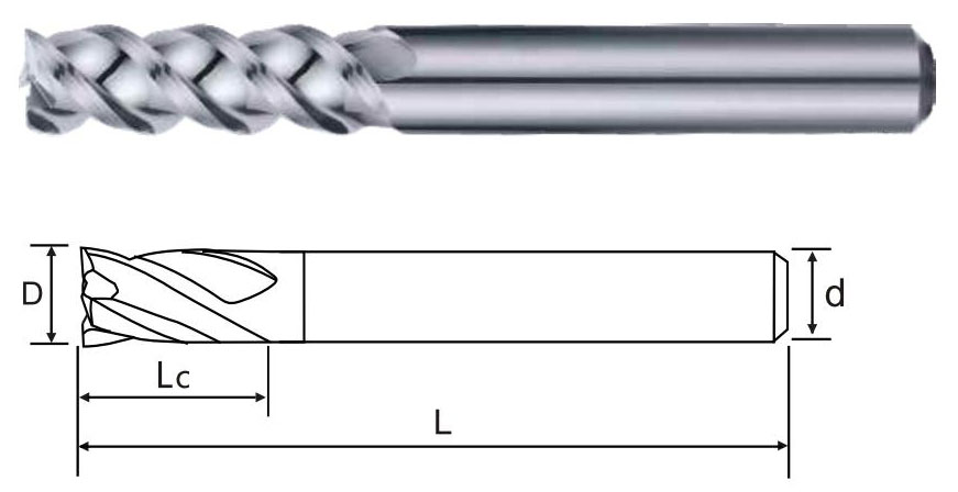 商品編號 Product number | 刃徑(D) Blade diameter | 刃長(Lc) Blade length | 柄徑(d) Shank diameter | 全長(L) Overall length | 刃數 Flute |