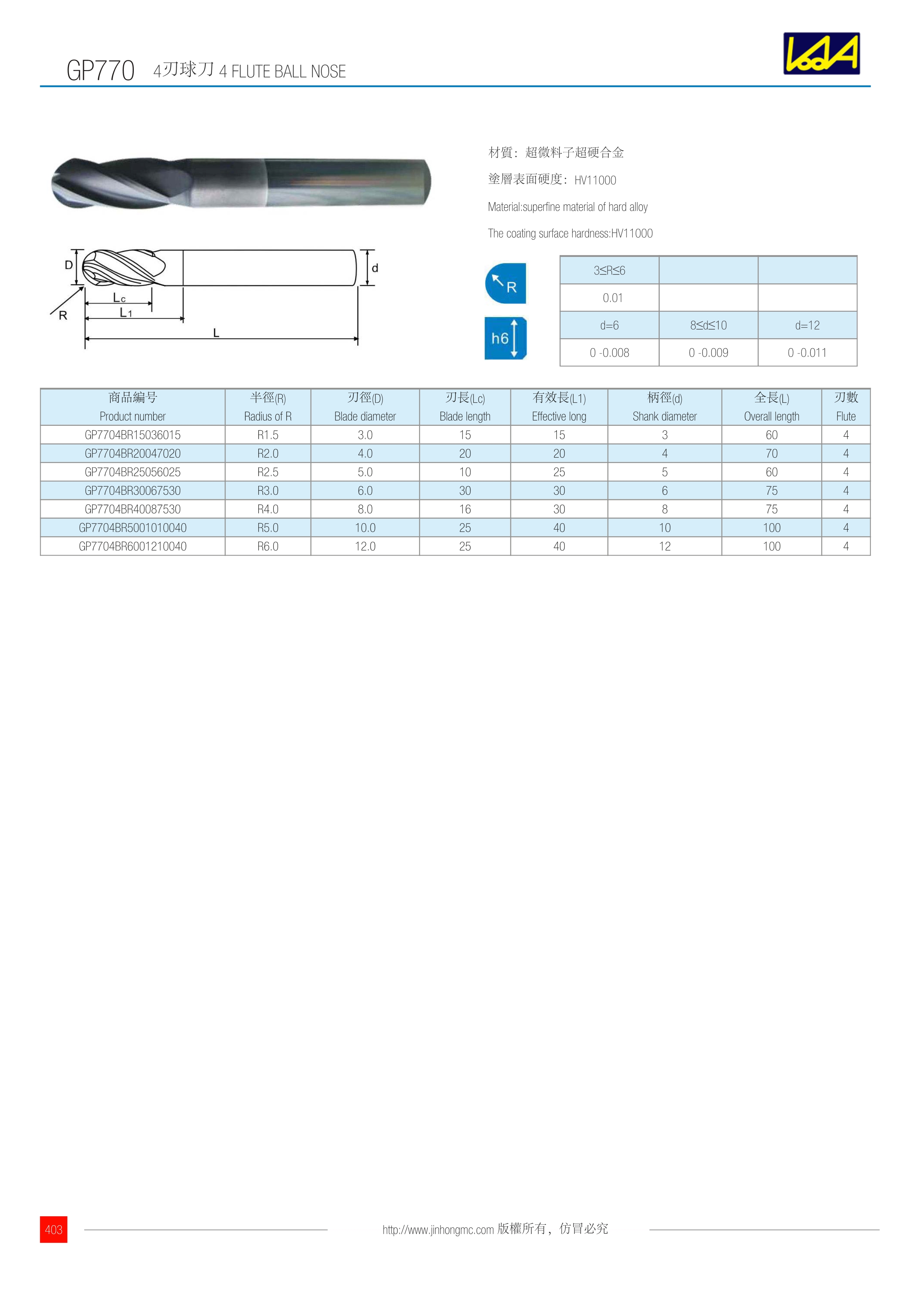 商品編號 Product number | 半徑(R) Radius of R | 刃徑(D) Blade diameter | 刃長(Lc) Blade length | 有效長(L1) Effective long | 柄徑(d) Shank diameter | 全長(L) Overall length | 刃數 Flute |