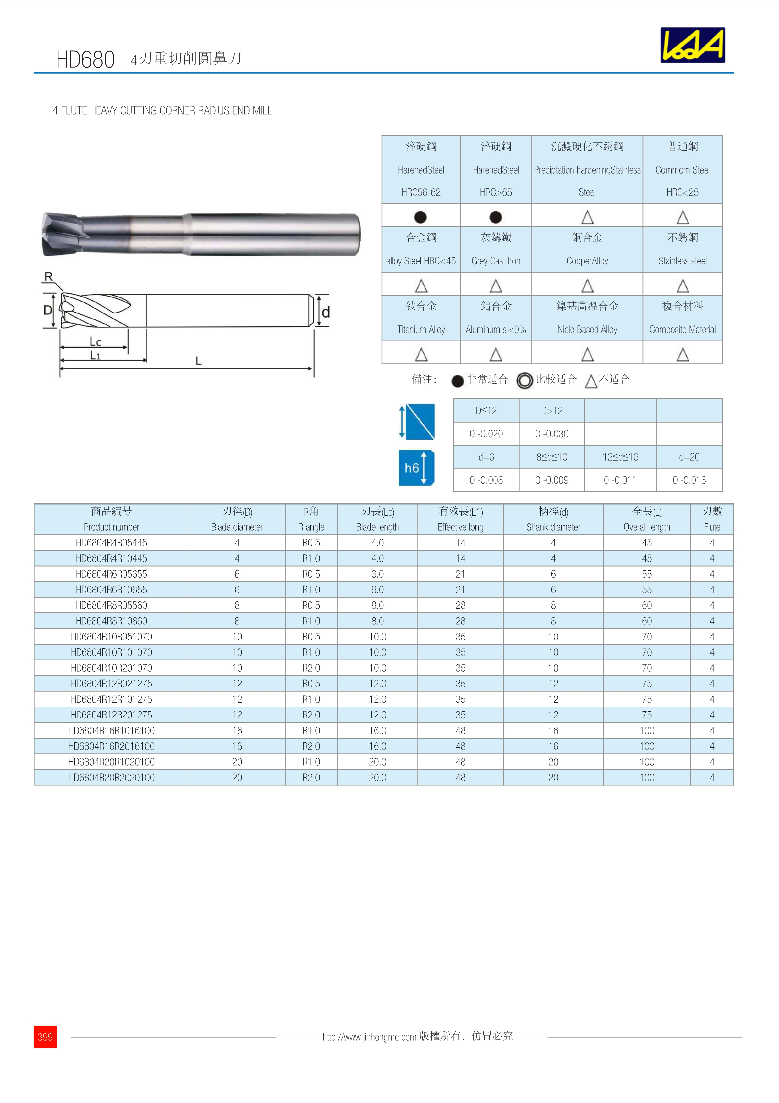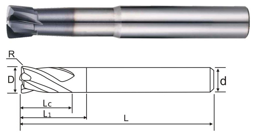 商品編號 Product number | 刃徑(D) Blade diameter | R角 R angle | 刃長(Lc) Blade length | 有效長(L1) Effective long | 柄徑(d) Shank diameter | 全長(L) Overall length | 刃數 Flute |