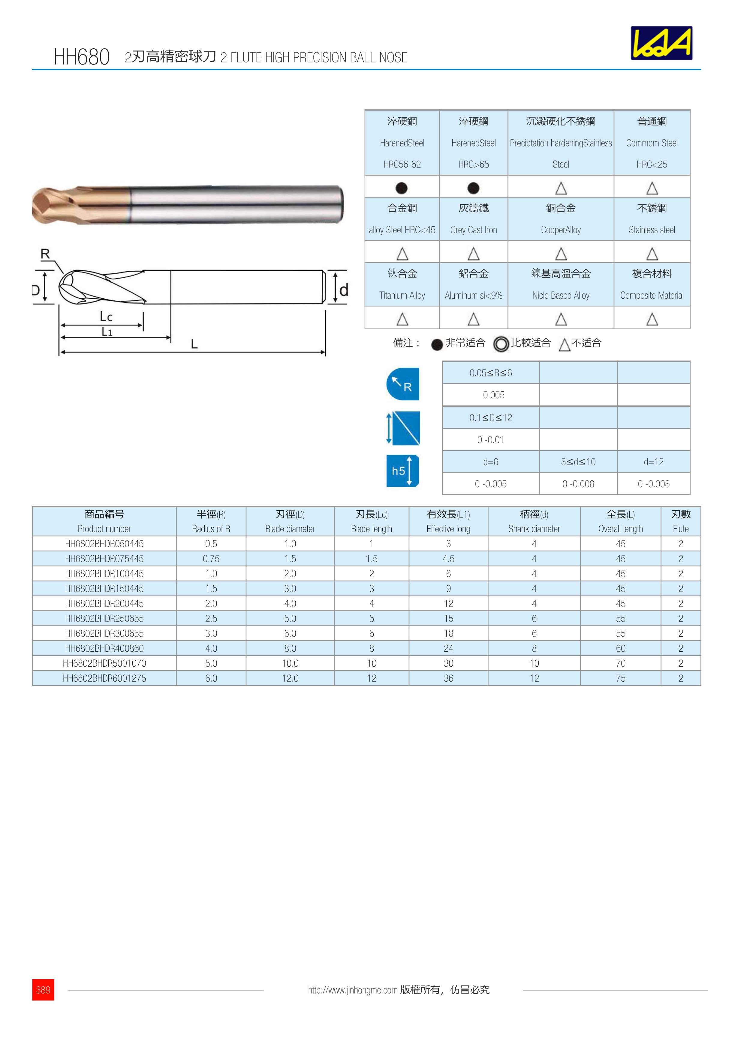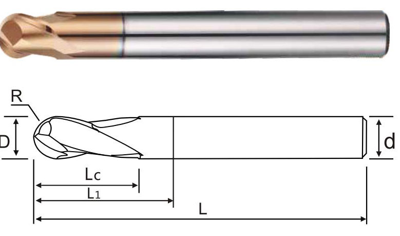 商品編號 Product number | 半徑(R) Radius of R | 刃徑(D) Blade diameter | 刃長(Lc) Blade length | 有效長(L1) Effective long | 柄徑(d) Shank diameter | 全長(L) Overall length | 刃數 Flute |