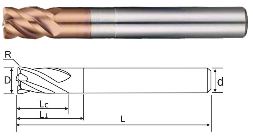 商品編號 Product number | 刃徑(D) Blade diameter | R角 R angle | 刃長(Lc) Blade length | 有效長(L1) Effective long | 柄徑(d) Shank diameter | 全長(L) Overall length | 刃數 Flute |