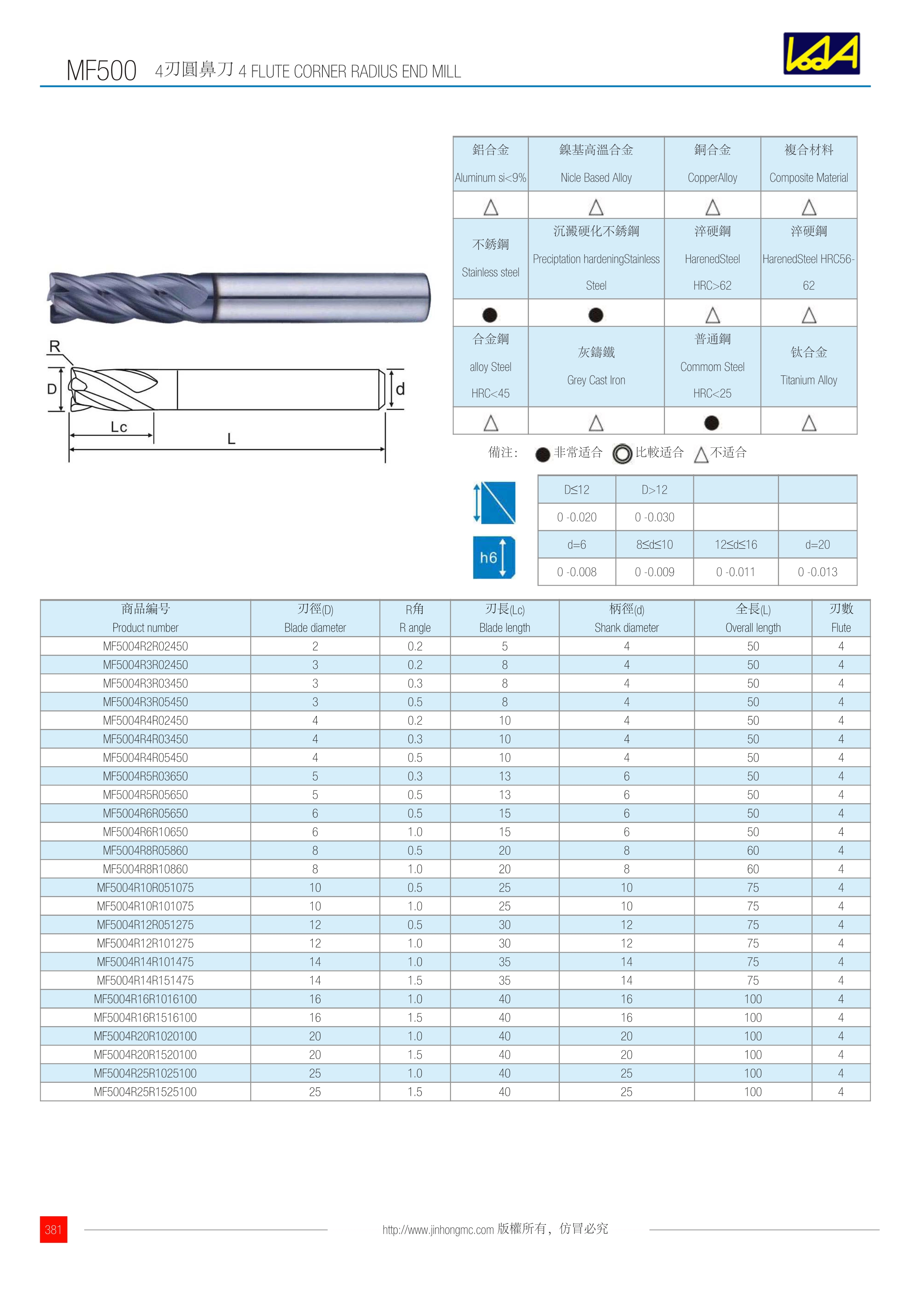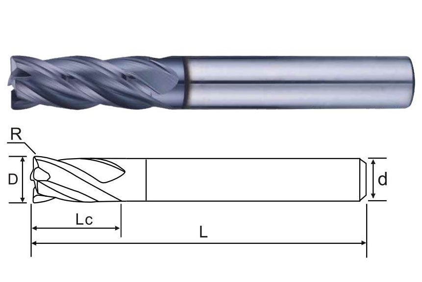 商品編號 Product number | 刃徑(D) Blade diameter | R角 R angle | 刃長(Lc) Blade length | 柄徑(d) Shank diameter | 全長(L) Overall length | 刃數 Flute |