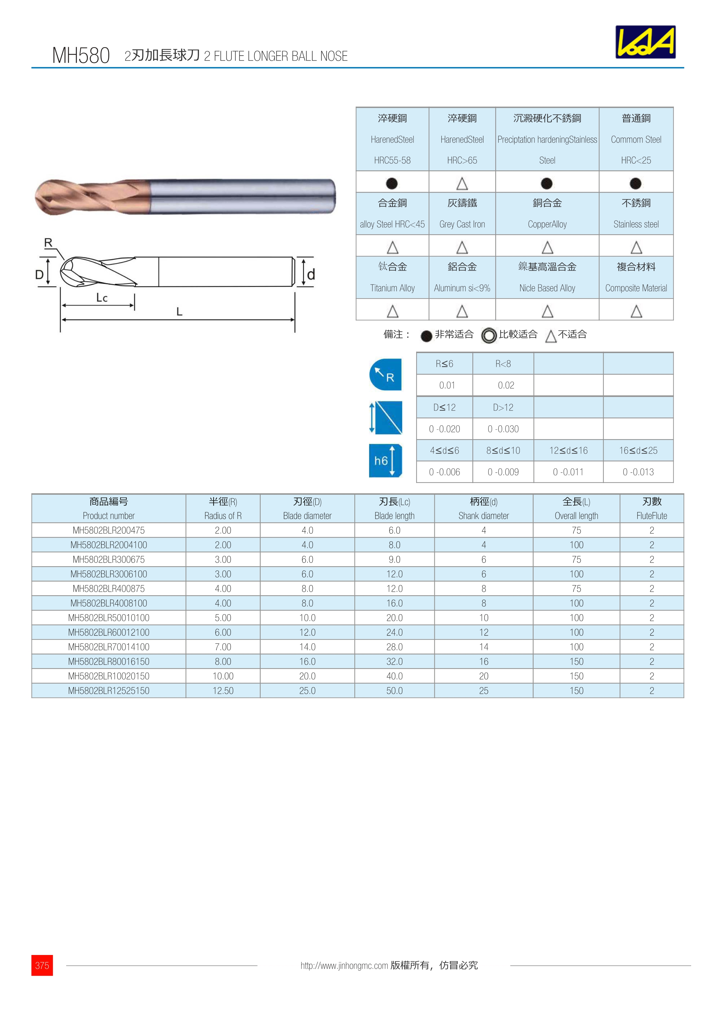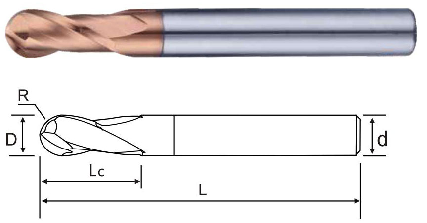 商品編號 Product number | 半徑(R) Radius of R | 刃徑(D) Blade diameter | 刃長(Lc) Blade length | 柄徑(d) Shank diameter | 全長(L) Overall length | 刃數 FluteFlute |