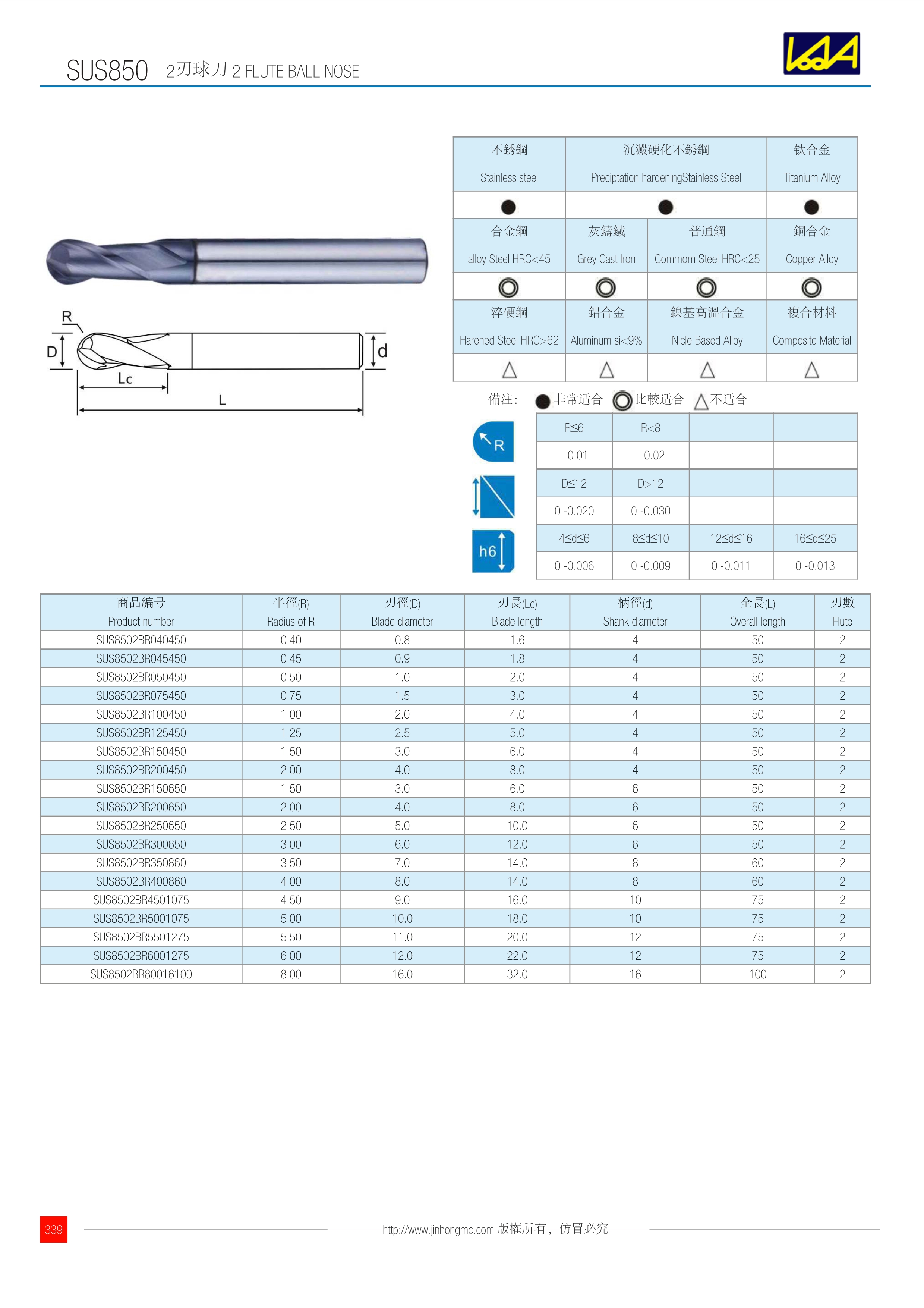 商品編號 Product number | 半徑(R) Radius of R | 刃徑(D) Blade diameter | 刃長(Lc) Blade length | 柄徑(d) Shank diameter | 全長(L) Overall length | 刃數 Flute |