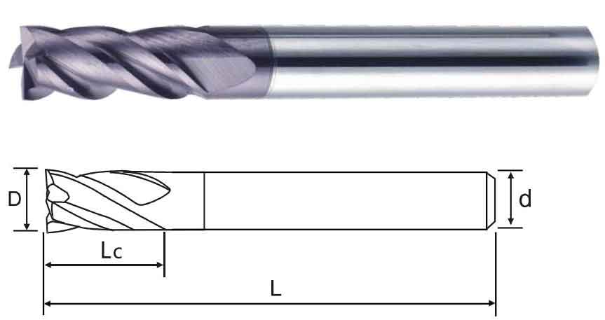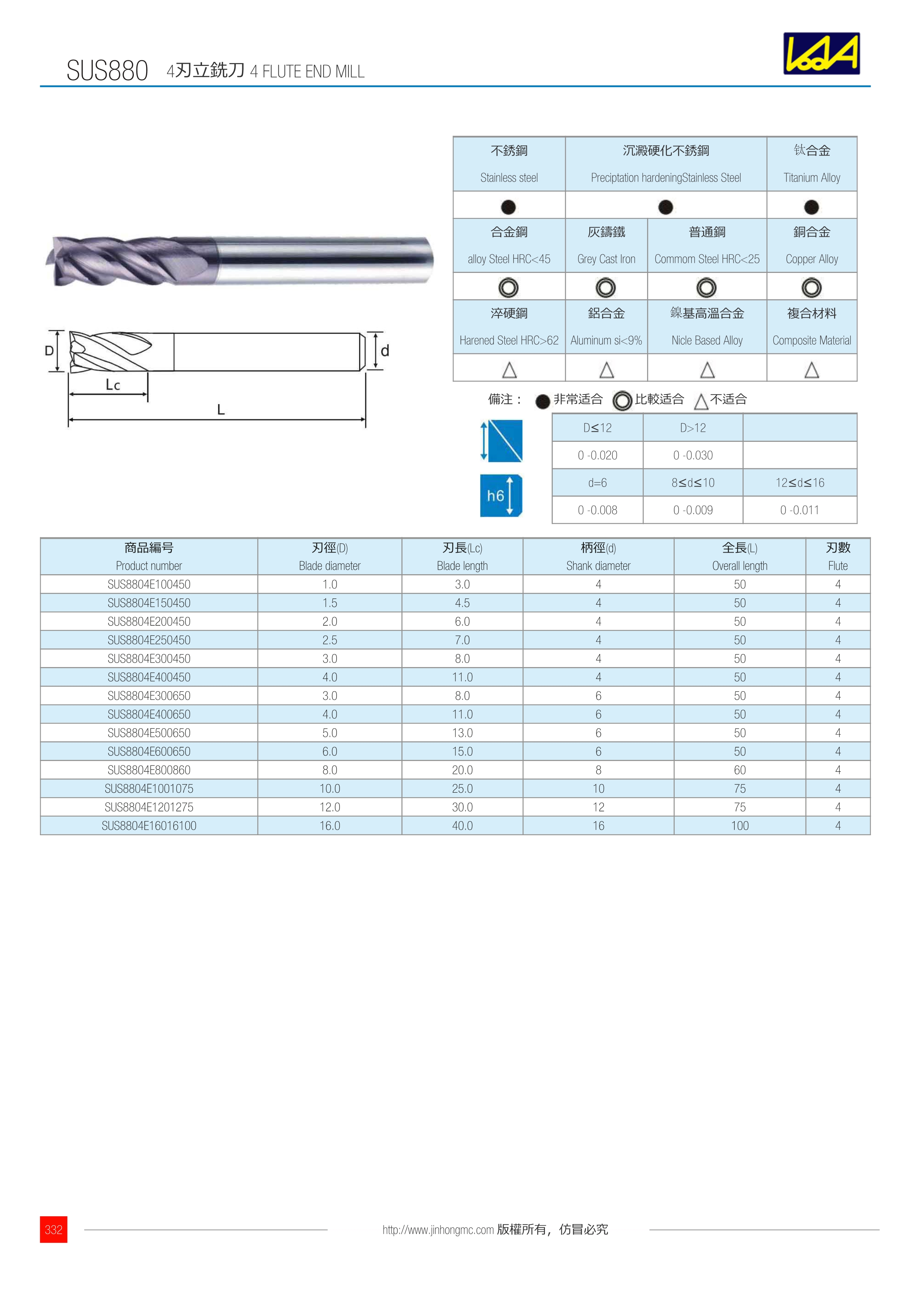 商品編號 Product number | 刃徑(D) Blade diameter | 刃長(Lc) Blade length | 柄徑(d) Shank diameter | 全長(L) Overall length | 刃數(shù) Flute |